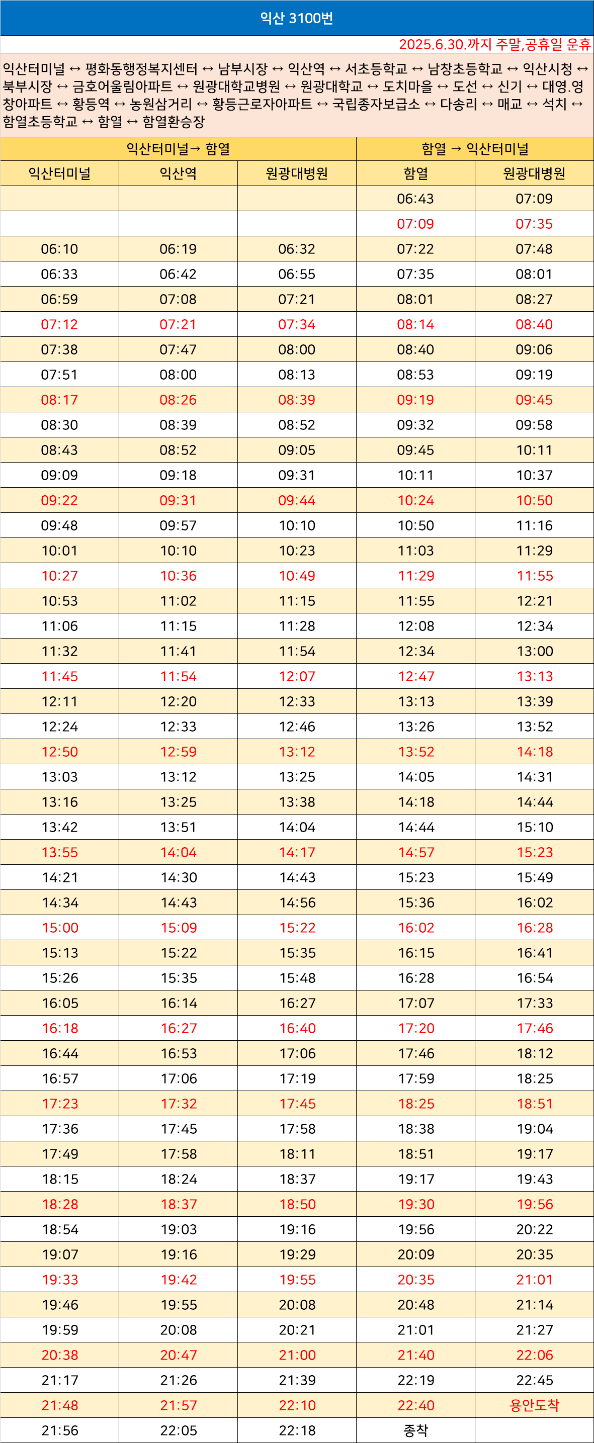 익산 3100번: 익산터미널 ↔ 평화동행정복지센터 ↔ 남부시장 ↔ 익산역 ↔ 서초등학교 ↔ 남창초등학교 ↔ 익산시청 ↔ 북부시장 ↔ 금호어울림아파트 ↔ 원광대학교병원 ↔ 원광대학교 ↔ 도치마을 ↔ 도선 ↔ 신기 ↔ 대영.영창아파트 ↔ 황등역 ↔ 농원삼거리 ↔ 황등근로자아파트 ↔ 국립종자보급소 ↔ 다송리 ↔ 매교 ↔ 석치 ↔ 함열초등학교 ↔ 함열 ↔ 함열환승장