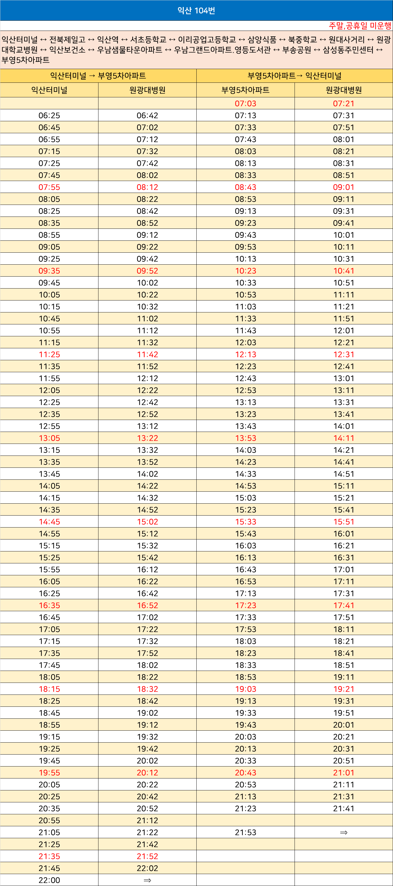 익산 104번: 익산터미널 ↔ 전북제일고 ↔ 익산역 ↔ 서초등학교 ↔ 이리공업고등학교 ↔ 삼양식품 ↔ 북중학교 ↔ 원대사거리 ↔ 원광대학교병원 ↔ 익산보건소 ↔ 우남샘물타운아파트 ↔ 우남그랜드아파트.영등도서관 ↔ 부송공원 ↔ 삼성동주민센터 ↔ 부영5차아파트