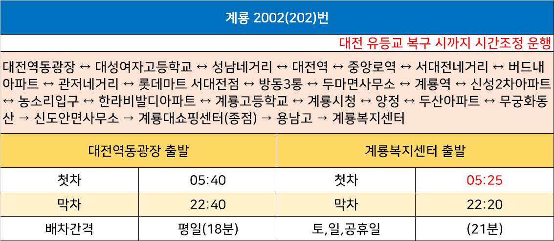 계룡 202번: 대전역동광장 ↔ 대성여자고등학교 ↔ 성남네거리 ↔ 대전역 ↔ 중앙로역 ↔ 서대전네거리 ↔ 버드내아파트 ↔ 도마네거리 ↔ 서부소방서 ↔ 가수원육교.가수원시장 ↔ 관저네거리 ↔ 롯데마트 서대전점 ↔ 방동3통 ↔ 두마면사무소 ↔ 계룡역 ↔ 신성2차아파트 ↔ 농소리입구 ↔ 한라비발디아파트 ↔ 계룡고등학교 ↔ 계룡시청 ↔ 양정 ↔ 두산아파트 ↔ 무궁화동산 → 신도안면사무소 → 계룡대쇼핑센터(종점) → 용남고 → 계룡복지센터