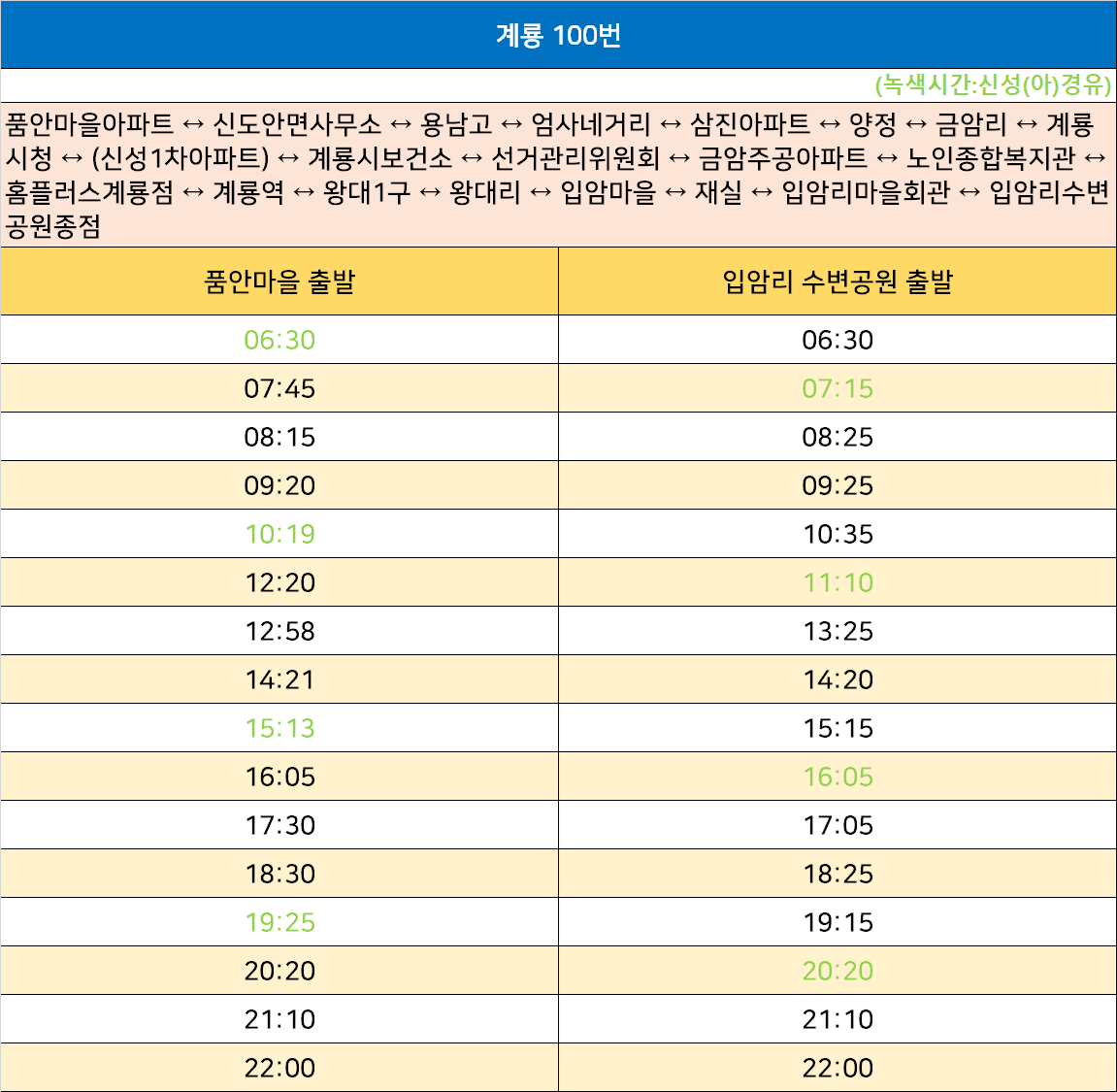 계룡 100번: 품안마을아파트 ↔ 신도안면사무소 ↔ 용남고 ↔ 엄사네거리 ↔ 삼진아파트 ↔ 양정 ↔ 금암리 ↔ 계룡시청 ↔ (신성1차아파트) ↔ 계룡시보건소 ↔ 선거관리위원회 ↔ 금암주공아파트 ↔ 노인종합복지관 ↔ 홈플러스계룡점 ↔ 계룡역 ↔ 왕대1구 ↔ 왕대리 ↔ 입암마을 ↔ 재실 ↔ 입암리마을회관 ↔ 입암리수변공원종점