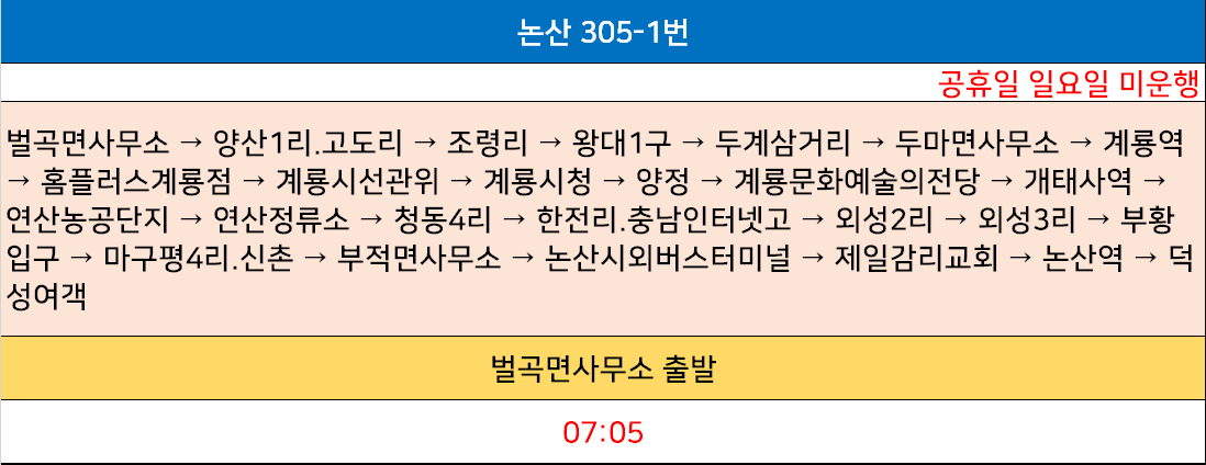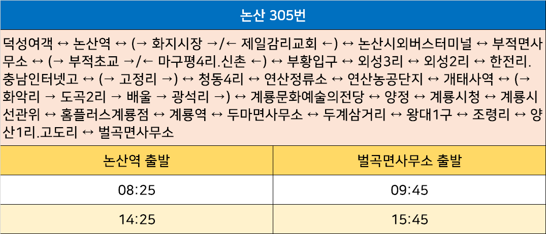 논산 305-1번: 벌곡면사무소 → 양산1리.고도리 → 조령리 → 왕대1구 → 두계삼거리 → 두마면사무소 → 계룡역 → 홈플러스계룡점 → 계룡시선관위 → 계룡시청 → 양정 → 계룡문화예술의전당 → 개태사역 → 연산농공단지 → 연산정류소 → 청동4리 → 한전리.충남인터넷고 → 외성2리 → 외성3리 → 부황입구 → 마구평4리.신촌 → 부적면사무소 → 논산시외버스터미널 → 제일감리교회 → 논산역 → 덕성여객