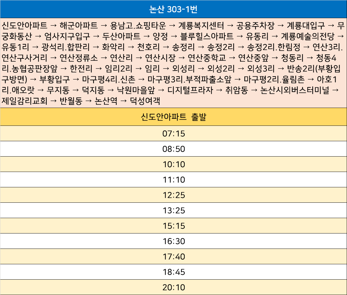 논산 303-1번: 신도안아파트 → 해군아파트 → 용남고.쇼핑타운 → 계룡복지센터 → 공용주차장 → 계룡대입구 → 무궁화동산 → 엄사지구입구 → 두산아파트 → 양정 → 블루힐스아파트 → 유동리 → 계룡예술의전당 → 유동1리 → 광석리.합판리 → 화악리 → 천호리 → 송정리 → 송정2리 → 송정2리.한림정 → 연산3리.연산구사거리 → 연산정류소 → 연산리 → 연산시장 → 연산중학교 → 연산중앞 → 청동리 → 청동4리.농협공판장앞 → 한전리 → 임리2리 → 임리 → 외성리 → 외성2리 → 외성3리 → 반송2리(부황입구방면) → 부황입구 → 마구평4리.신촌 → 마구평3리.부적파출소앞 → 마구평2리.율림촌 → 아호1리.애오랏 → 무지동 → 덕지동 → 낙원마을앞 → 디지털프라자 → 취암동 → 논산시외버스터미널 → 제일감리교회 → 반월동 → 논산역 → 덕성여객
