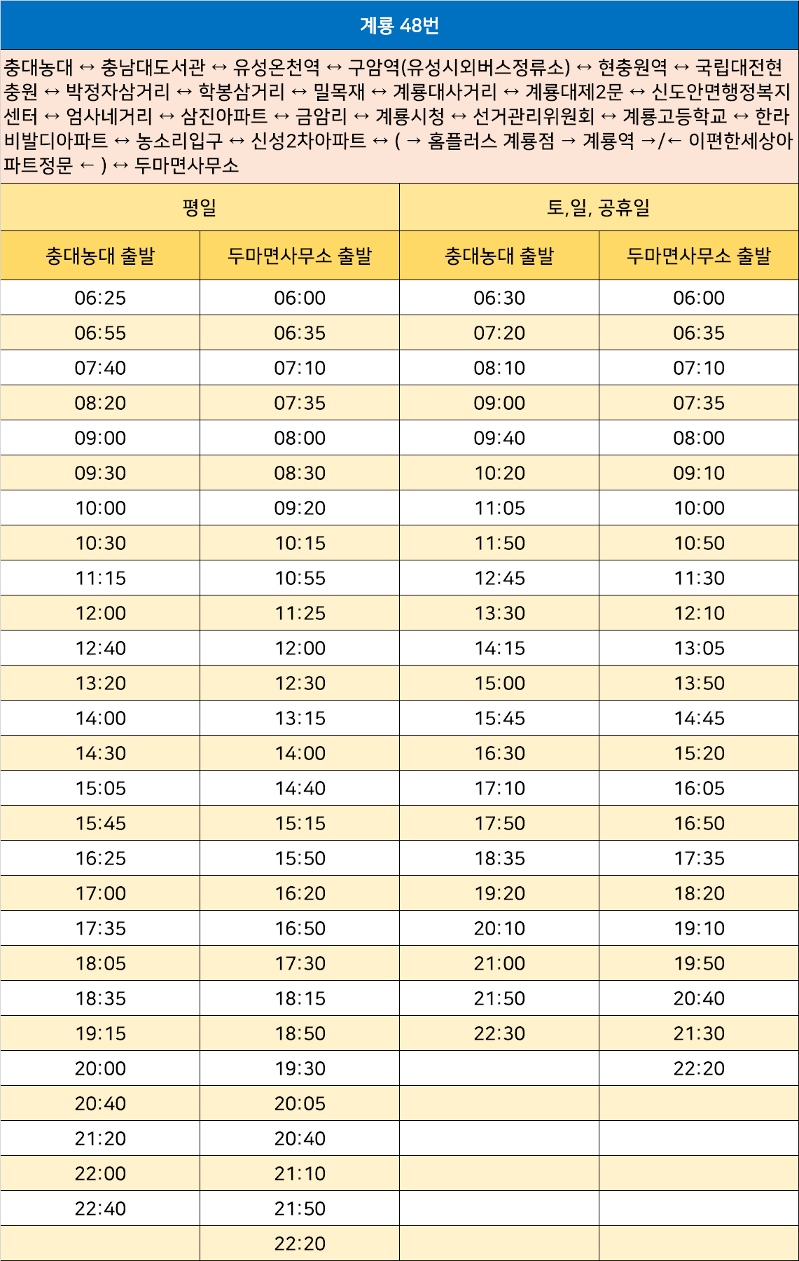 계룡 48번: 충대농대 ↔ 충남대도서관 ↔ 유성온천역 ↔ 구암역(유성시외버스정류소) ↔ 현충원역 ↔ 국립대전현충원 ↔ 박정자삼거리 ↔ 학봉삼거리 ↔ 밀목재 ↔ 계룡대사거리 ↔ 계룡대제2문 ↔ 신도안면행정복지센터 ↔ 엄사네거리 ↔ 삼진아파트 ↔ 금암리 ↔ 계룡시청 ↔ 선거관리위원회 ↔ 계룡고등학교 ↔ 한라비발디아파트 ↔ 농소리입구 ↔ 신성2차아파트 ↔ ( → 홈플러스 계룡점 → 계룡역 →/← 이편한세상아파트정문 ← ) ↔ 두마면사무소