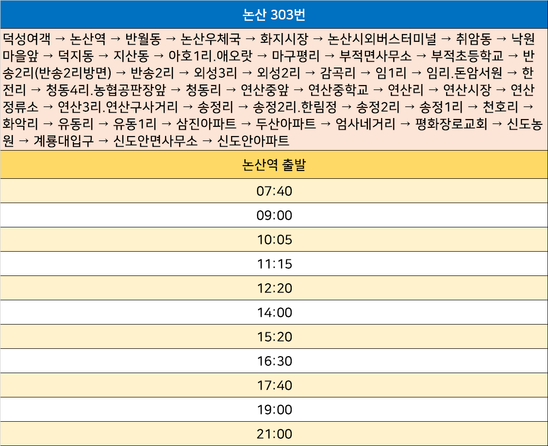 논산 303-2번: 덕성여객 → 논산역 → 반월동 → 논산우체국 → 화지시장 → 논산시외버스터미널 → 취암동 → 낙원마을앞 → 덕지동 → 지산동 → 아호1리.애오랏 → 마구평리 → 부적면사무소 → 부적초등학교 → 반송2리(반송2리방면) → 반송2리 → 외성3리 → 외성2리 → 감곡리 → 임1리 → 임리.돈암서원 → 한전리 → 청동4리.농협공판장앞 → 청동리 → 연산중앞 → 연산중학교 → 연산리 → 연산정류소 → 연산3리.연산구사거리 → 송정리 → 송정2리.한림정 → 송정2리 → 송정1리 → 천호리 → 화악리 → 유동리 → 유동1리 → 삼진아파트 → 두산아파트 → 엄사네거리 → 평화장로교회 → 신도농원 → 계룡대입구 → 신도안면사무소 → 신도안아파트