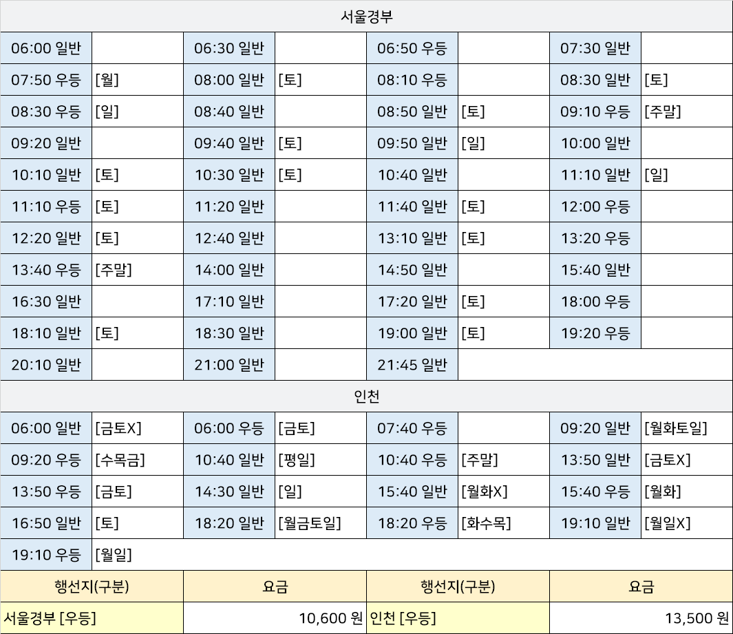 아산 고속버스 터미널 시간표/요금표 2025년 05월 14일 기준