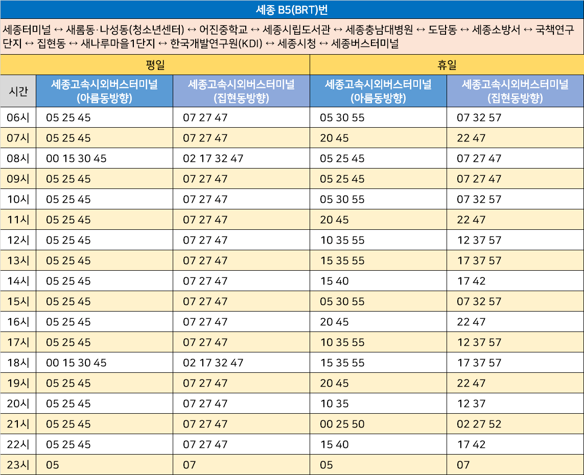 세종 B5(BRT)번: 세종터미널 ↔ 새롬동·나성동(청소년센터) ↔ 어진중학교 ↔ 세종시립도서관 ↔ 세종충남대병원 ↔ 도담동 ↔ 세종소방서 ↔ 국책연구단지 ↔ 집현동 ↔ 새나루마을1단지 ↔ 한국개발연구원(KDI) ↔ 세종시청 ↔ 세종버스터미널