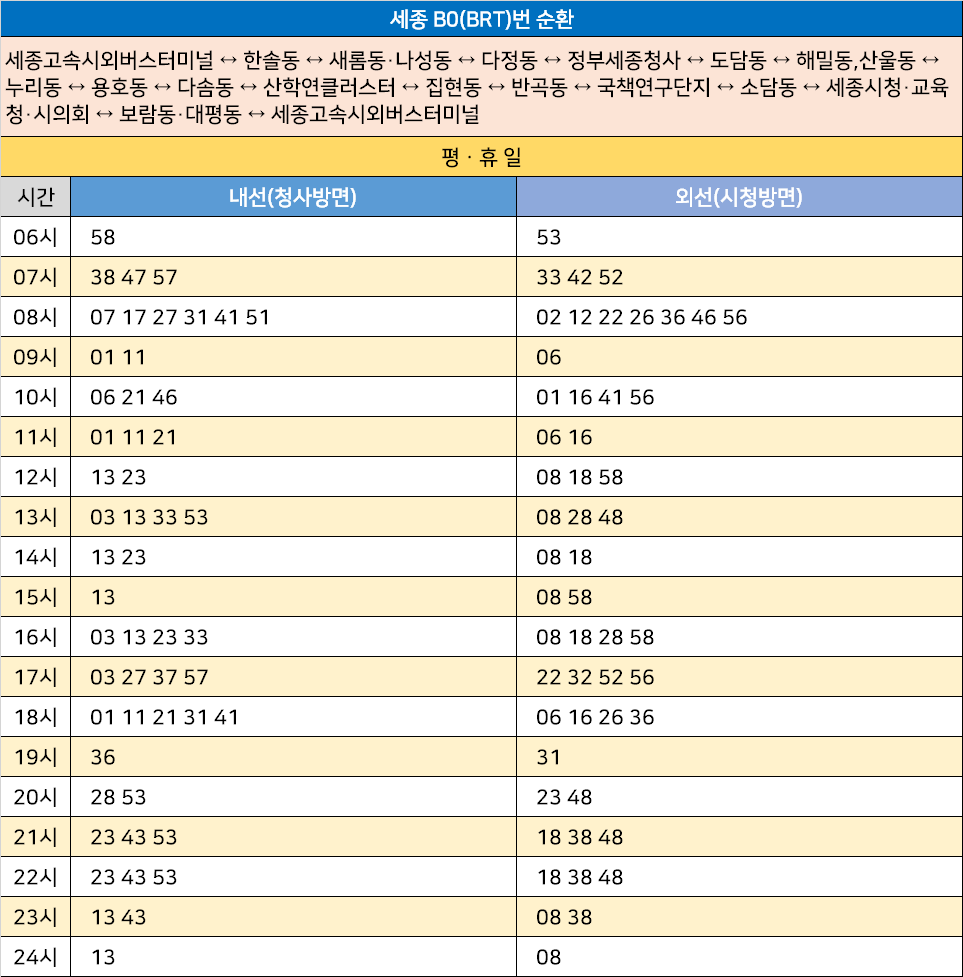 세종 B0(BRT)번: 세종고속시외버스터미널 ↔ 한솔동 ↔ 새롬동·나성동 ↔ 다정동 ↔ 정부세종청사 ↔ 도담동 ↔ 해밀동,산울동 ↔ 누리동 ↔ 용호동 ↔ 다솜동 ↔ 산학연클러스터 ↔ 집현동 ↔ 반곡동 ↔ 국책연구단지 ↔ 소담동 ↔ 세종시청·교육청·시의회 ↔ 보람동·대평동 ↔ 세종고속시외버스터미널