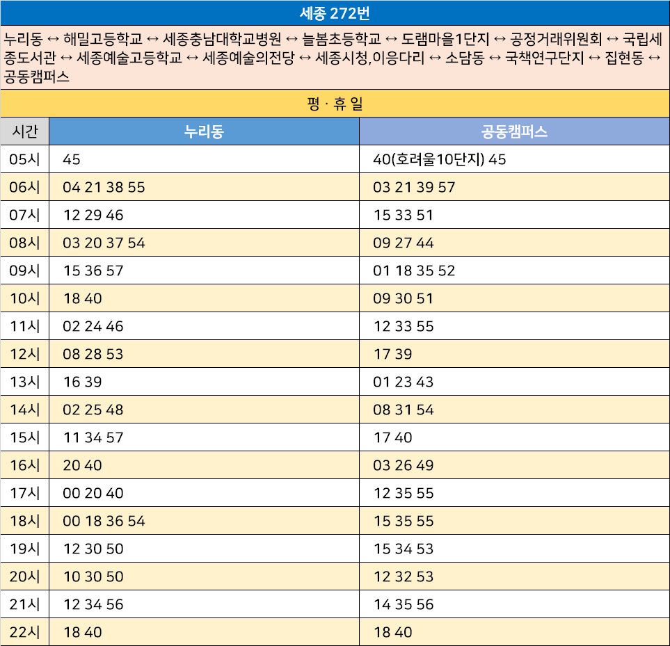 세종 272번: 누리동 ↔ 해밀고등학교 ↔ 세종충남대학교병원 ↔ 늘봄초등학교 ↔ 도램마을1단지 ↔ 공정거래위원회 ↔ 국립세종도서관 ↔ 세종예술고등학교 ↔ 세종예술의전당 ↔ 세종시청,이응다리 ↔ 소담동 ↔ 국책연구단지 ↔ 집현동 ↔ 공동캠퍼스