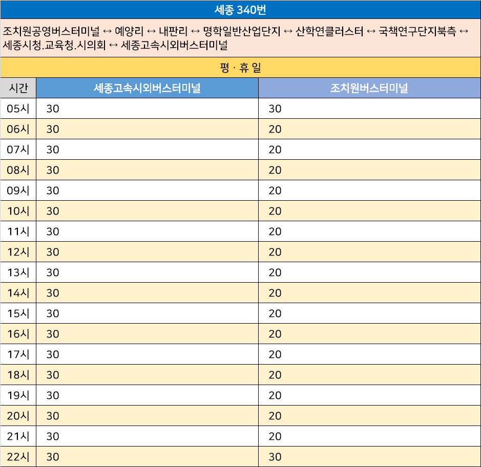 세종 340번: 조치원공영버스터미널 ↔ 예양리 ↔ 내판리 ↔ 명학일반산업단지 ↔ 산학연클러스터 ↔ 국책연구단지북측 ↔ 세종시청.교육청.시의회 ↔ 세종고속시외버스터미널