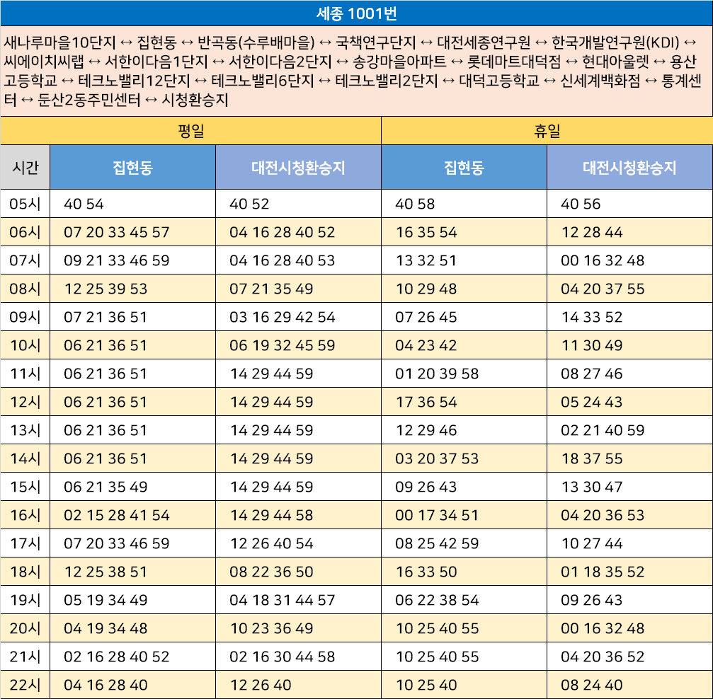 세종 1001번: 새나루마을10단지 ↔ 집현동 ↔ 반곡동(수루배마을) ↔ 국책연구단지 ↔ 대전세종연구원 ↔ 한국개발연구원(KDI) ↔ 씨에이치씨랩 ↔ 서한이다음1단지 ↔ 서한이다음2단지 ↔ 송강마을아파트 ↔ 롯데마트대덕점 ↔ 현대아울렛 ↔ 용산고등학교 ↔ 테크노밸리12단지 ↔ 테크노밸리6단지 ↔ 테크노밸리2단지 ↔ 대덕고등학교 ↔ 신세계백화점 ↔ 통계센터 ↔ 둔산2동주민센터 ↔ 시청환승지