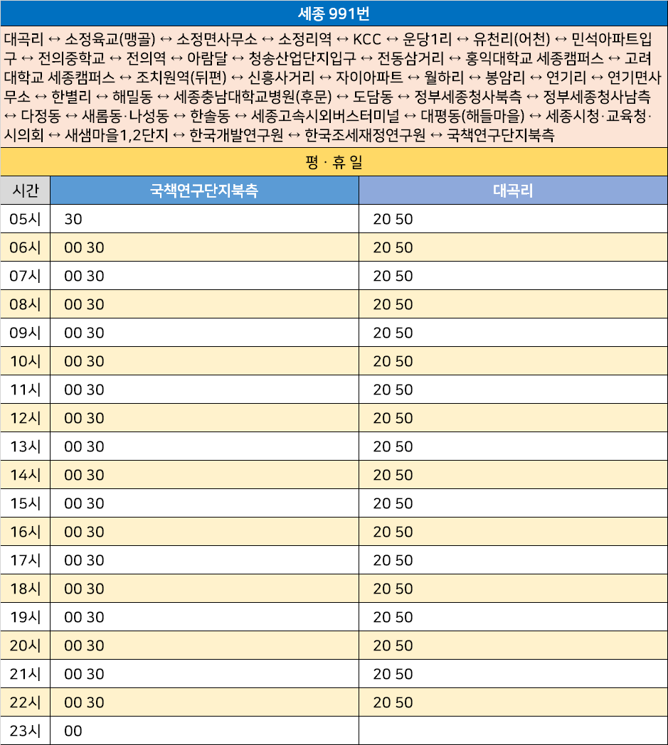 세종 991번: 대곡리 ↔ 소정육교(맹골) ↔ 소정면사무소 ↔ 소정리역 ↔ KCC ↔ 운당1리 ↔ 유천리(어천) ↔ 민석아파트입구 ↔ 전의중학교 ↔ 전의역 ↔ 아람달 ↔ 청송산업단지입구 ↔ 전동삼거리 ↔ 홍익대학교 세종캠퍼스 ↔ 고려대학교 세종캠퍼스 ↔ 조치원역(뒤편) ↔ 신흥사거리 ↔ 자이아파트 ↔ 월하리 ↔ 봉암리 ↔ 연기리 ↔ 연기면사무소 ↔ 한별리 ↔ 해밀동 ↔ 세종충남대학교병원(후문) ↔ 도담동 ↔ 정부세종청사북측 ↔ 정부세종청사남측 ↔ 다정동 ↔ 새롬동·나성동 ↔ 한솔동 ↔ 세종고속시외버스터미널 ↔ 대평동(해들마을) ↔ 세종시청·교육청·시의회 ↔ 새샘마을1,2단지 ↔ 한국개발연구원 ↔ 한국조세재정연구원 ↔ 국책연구단지북측