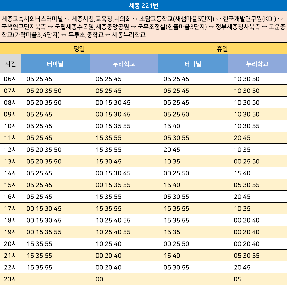 세종 221번: 세종고속시외버스터미널 ↔ 세종시청,교육청,시의회 ↔ 소담고등학교(새샘마을5단지) ↔ 한국개발연구원(KDI) ↔ 국책연구단지북측 ↔ 국립세종수목원,세종중앙공원 ↔ 국무조정실(한뜰마을3단지) ↔ 정부세종청사북측 ↔ 고운중학교(가락마을3,4단지) ↔ 두루초,중학교 ↔ 세종누리학교