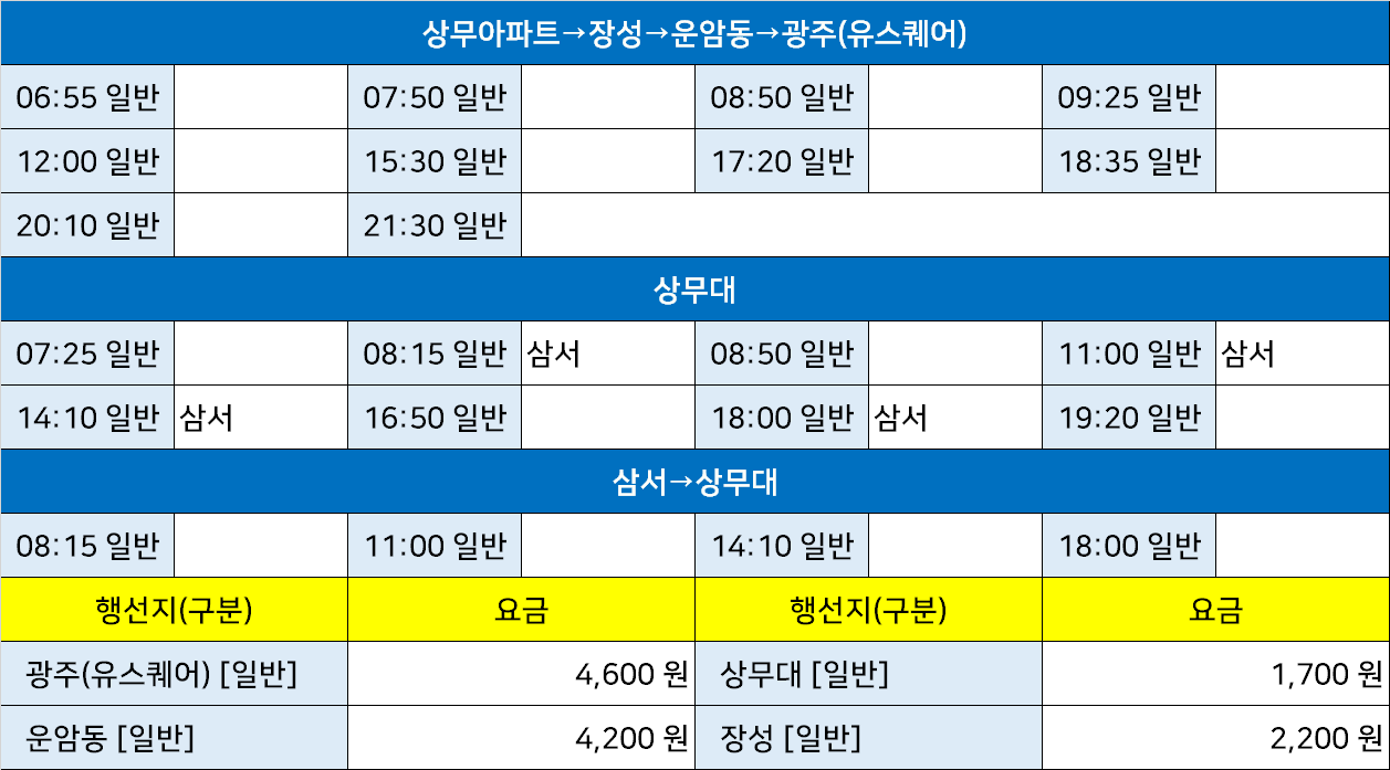 장성사창광신시외고속정류소 장성사창정류장 장성사창터미널 → "삼서→상무대,상무아파트→장성→운암동→광주(유스퀘어)".