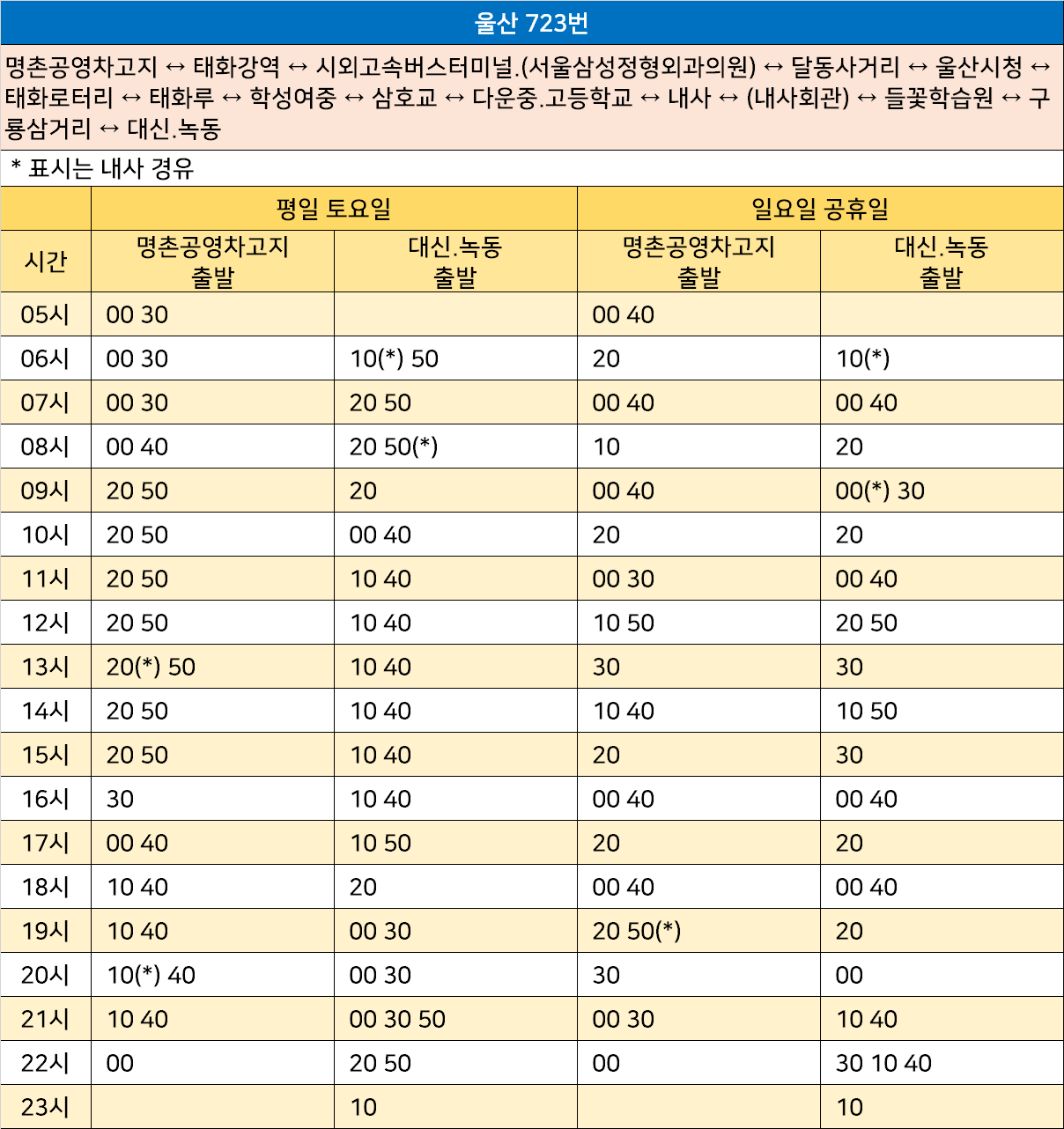 울산 723번: 명촌공영차고지 ↔ 태화강역 ↔ 시외고속버스터미널.(서울삼성정형외과의원) ↔ 달동사거리 ↔ 울산시청 ↔ 태화로터리 ↔ 태화루 ↔ 학성여중 ↔ 삼호교 ↔ 다운중.고등학교 ↔ 내사 ↔ (내사회관) ↔ 들꽃학습원 ↔ 구룡삼거리 ↔ 대신.녹동