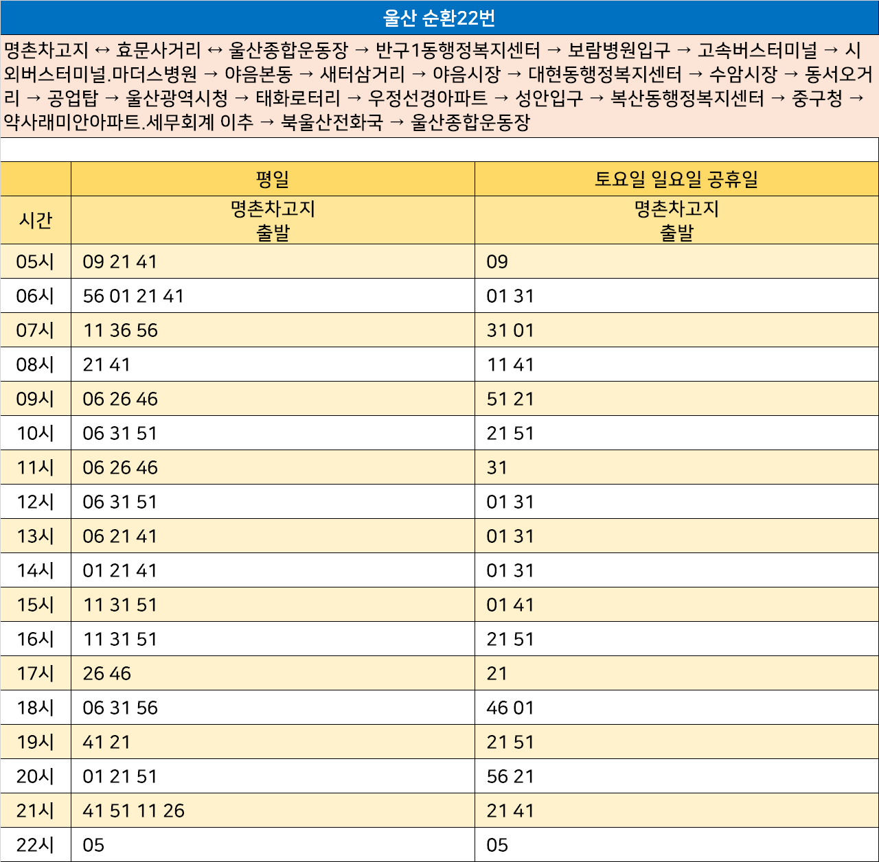 울산 순환22번: 명촌차고지 ↔ 효문사거리 ↔ 울산종합운동장 → 반구1동행정복지센터 → 보람병원입구 → 고속버스터미널 → 시외버스터미널.마더스병원 → 야음본동 → 새터삼거리 → 야음시장 → 대현동행정복지센터 → 수암시장 → 동서오거리 → 공업탑 → 울산광역시청 → 태화로터리 → 우정선경아파트 → 성안입구 → 복산동행정복지센터 → 중구청 → 약사래미안아파트.세무회계 이추 → 북울산전화국 → 울산종합운동장