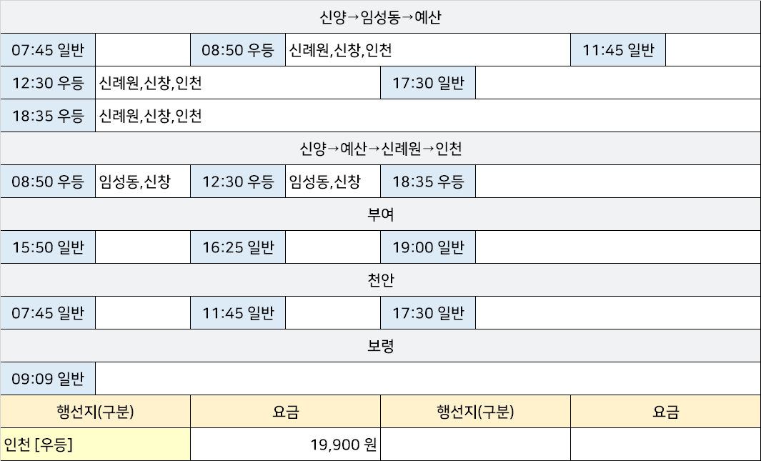 운곡시외고속버스터미널 운곡정류장 운곡정류소 → "보령,부여,신양→예산→신례원→인천,신양→임성동→예산,신창,천안".