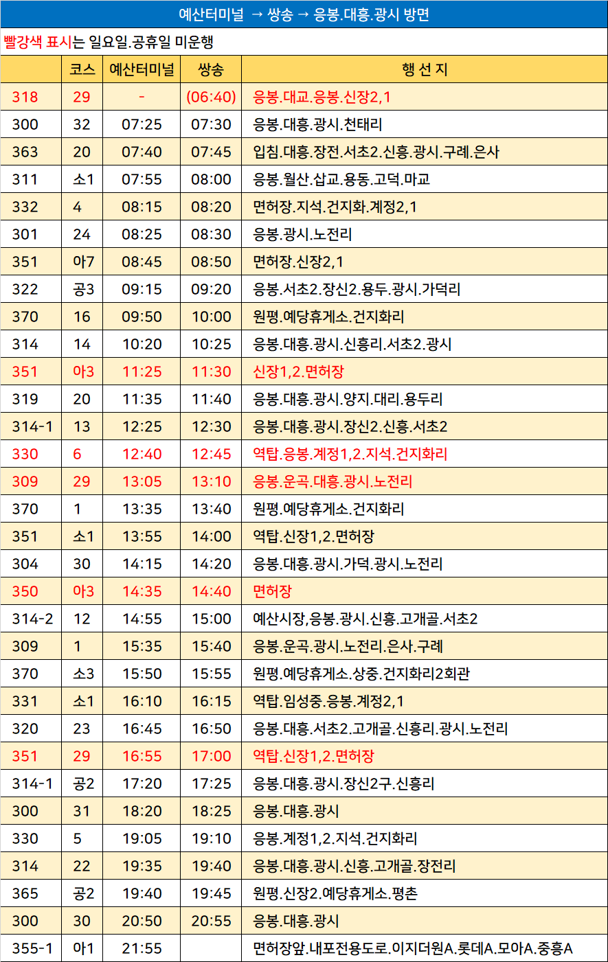 예산터미널 → 쌍송 → 응봉.대흥.광시 방면 노선정보: 가덕, 가덕리, 건지화리, 계정, 고개골, 고덕, 광시, 구례, 내포전용도로, 노전리, 대교, 대리, 대흥, 롯데A, 마교, 면허장, 모아A, 삽교, 상중, 서초, 신장, 신흥리, 양지, 역탑, 예당휴게소, 예산시장, 용동, 용두리, 운곡, 원평, 월산, 은사, 응봉, 이지더원A, 임성중, 입침, 장신, 장전리, 중흥A, 지석, 천태리, 평촌