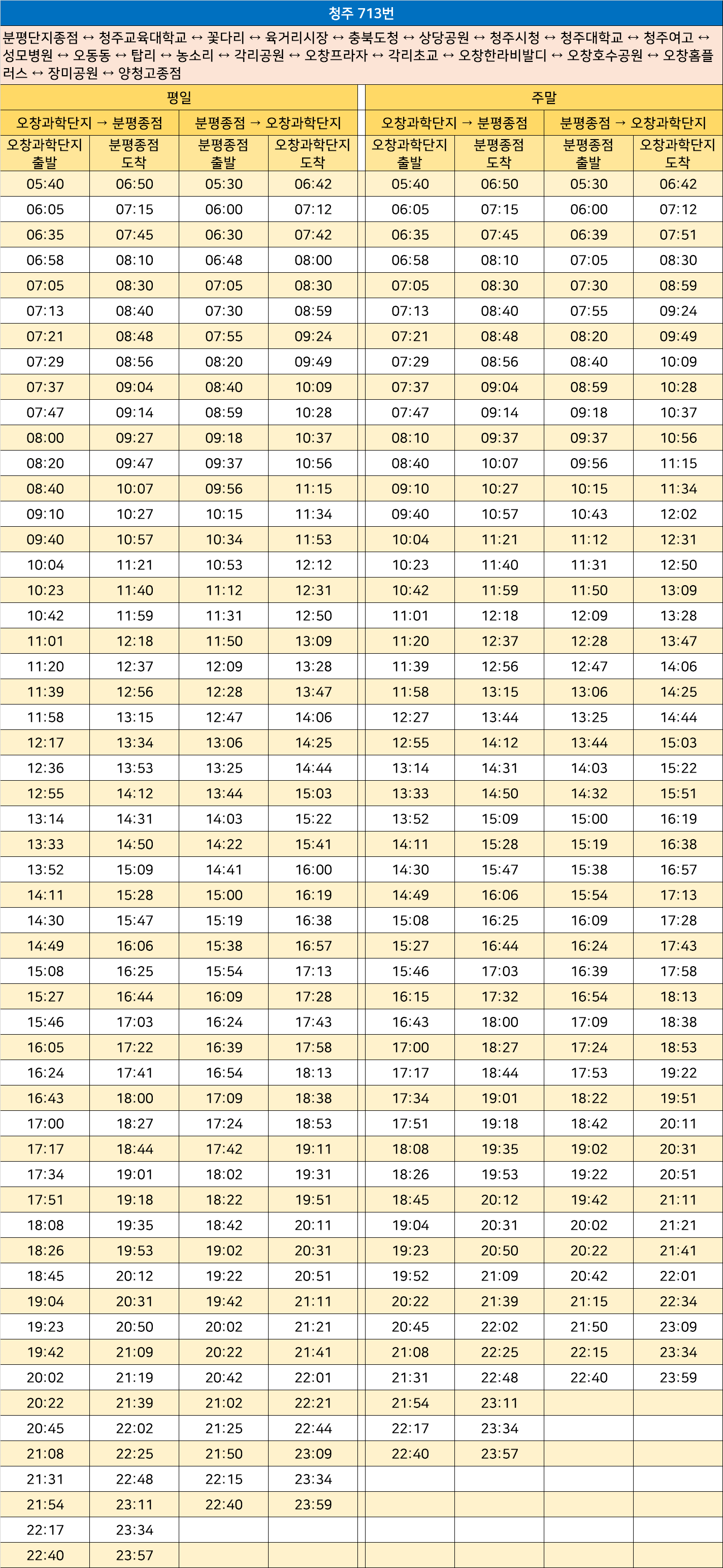 청주 713번: 분평단지종점 ↔ 청주교육대학교 ↔ 꽃다리 ↔ 육거리시장 ↔ 충북도청 ↔ 상당공원 ↔ 청주시청 ↔ 청주대학교 ↔ 청주여고 ↔ 성모병원 ↔ 오동동 ↔ 탑리 ↔ 농소리 ↔ 각리공원 ↔ 오창프라자 ↔ 각리초교 ↔ 오창한라비발디 ↔ 오창호수공원 ↔ 오창홈플러스 ↔ 장미공원 ↔ 양청고종점