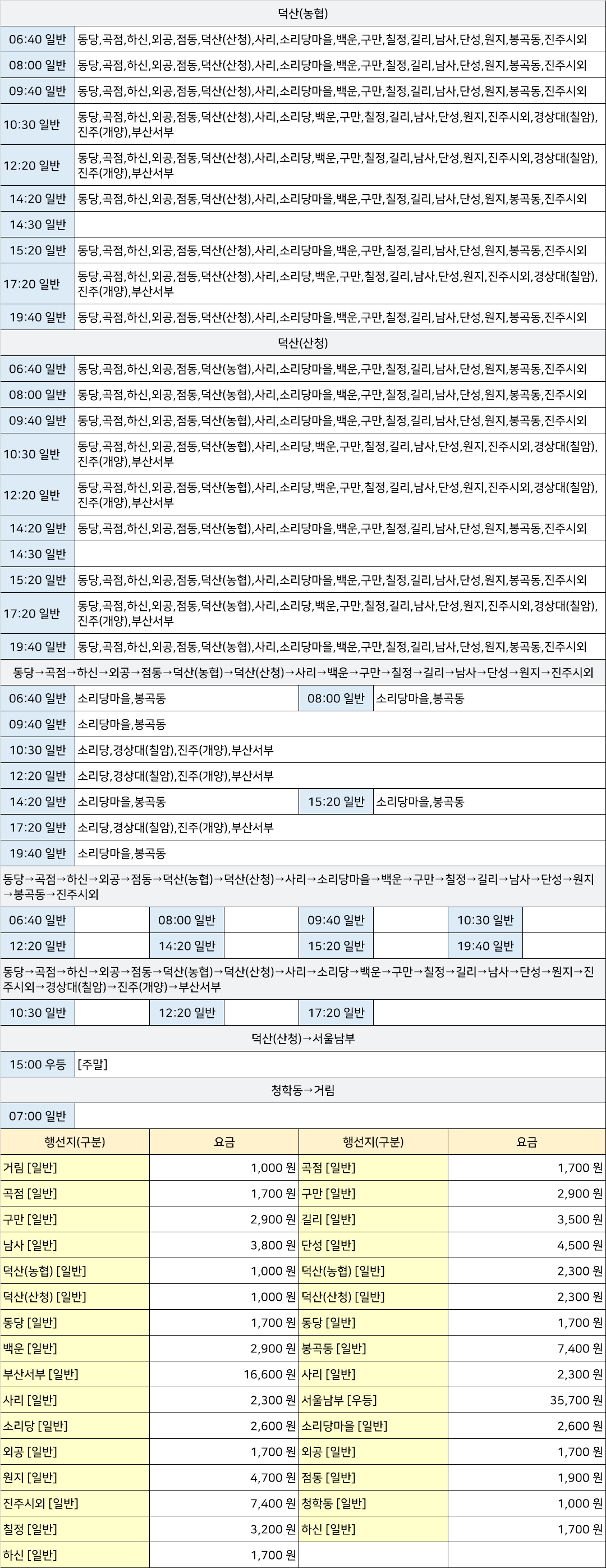 중산리시외고속버스터미널 중산리정류장 중산리정류소 → "덕산(산청)→서울남부,동당→곡점→하신→외공→점동→덕산(농협)→덕산(산청)→사리→백운→구만→칠정→길리→남사→단성→원지→진주시외,동당→곡점→하신→외공→점동→덕산(농협)→덕산(산청)→사리→소리당→백운→구만→칠정→길리→남사→단성→원지→진주시외→경상대(칠암)→진주(개양)→부산서부,동당→곡점→하신→외공→점동→덕산(농협)→덕산(산청)→사리→소리당마을→백운→구만→칠정→길리→남사→단성→원지→봉곡동→진주시외,청학동→거림".