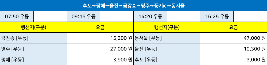 온정종합시외고속버스터미널 온정정류장 온정정류소 → "후포→평해→울진→금강송→영주→풍기ic→동서울".