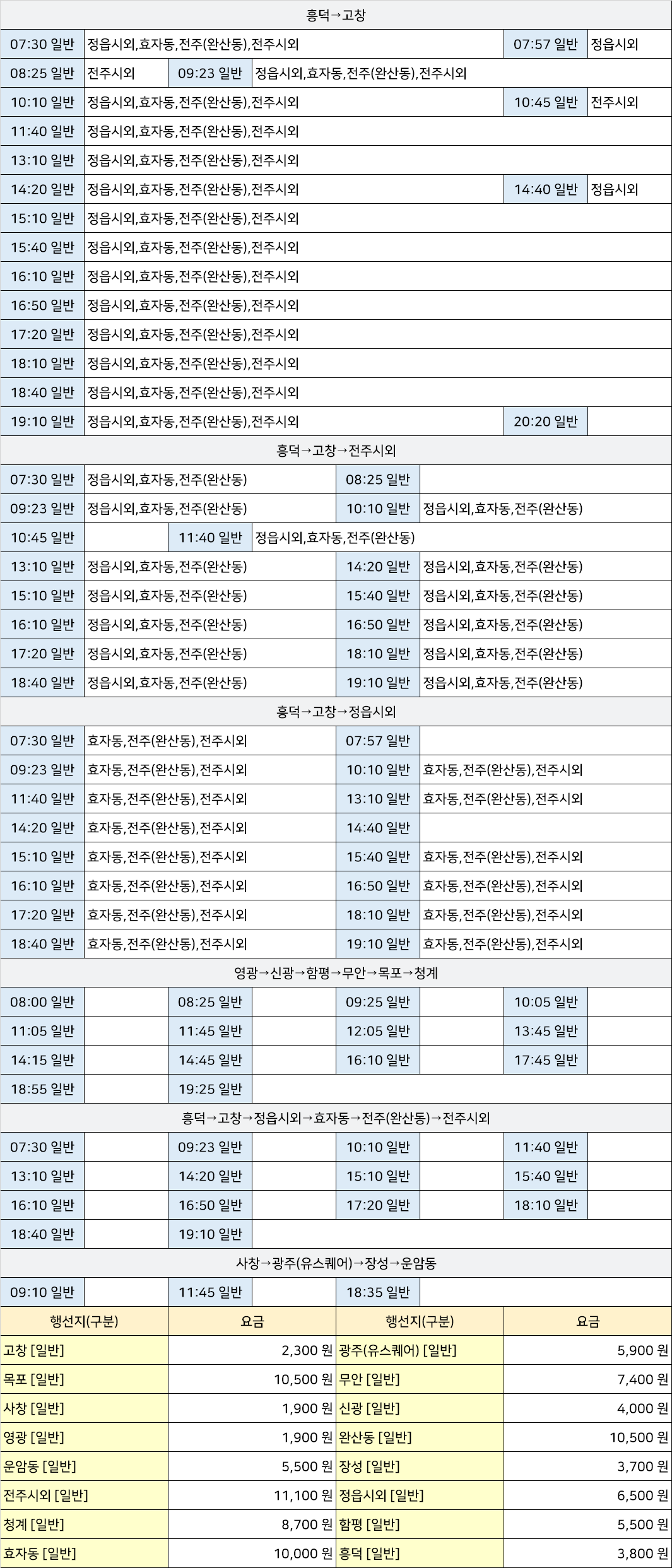 대산공용시외고속버스터미널 대산공용버스정류장 대산공용버스정류소 → "사창→광주(유스퀘어)→장성→운암동,영광→신광→함평→무안→목포→청계,흥덕→고창→전주시외,흥덕→고창→정읍시외→효자동→전주(완산동)→전주시외".
