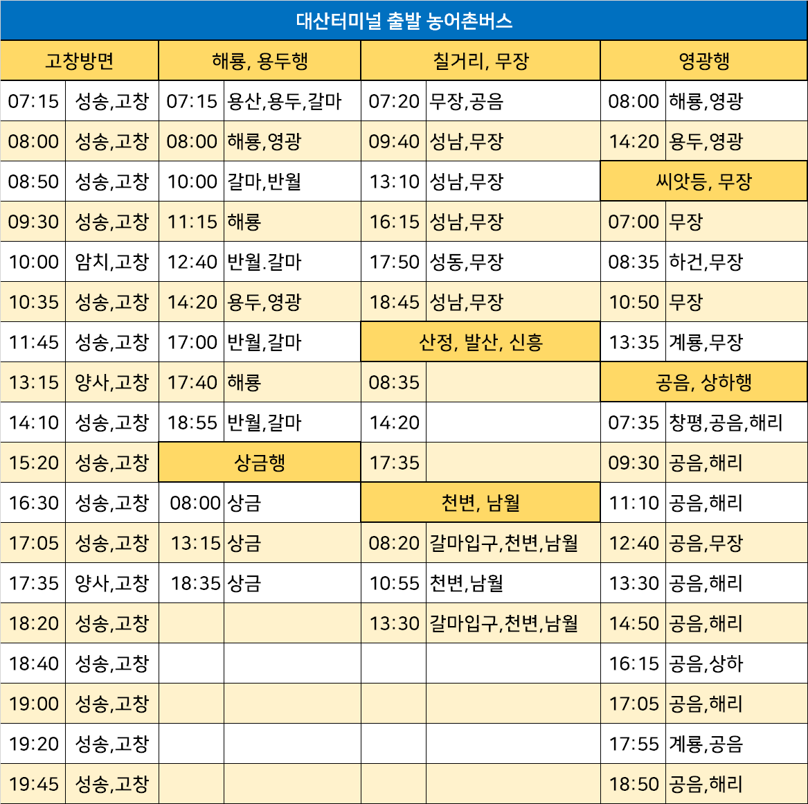 대산터미널 출발 농어촌버스 노선: 갈마, 계룡, 고창, 공음, 남월, 무장, 반월, 갈마, 발산, 산정, 상금, 상하, 성남, 성동, 성송, 신흥, 씨앗등, 암치, 양사, 영광, 용두, 용산, 창평, 천변, 칠거리, 하건, 해룡, 해리