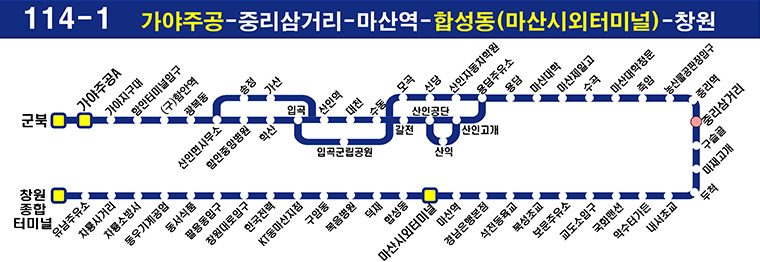 서촌,대산,로봇고,사촌,유원,이룡,신계,청계(칠서면),칠북,운곡,기공A,오곡,칠원,무기(대동A),수정그린,벽산블루밍,GS자이,중리,교도소입구,북성초교,회산교(북마산시장),어시장,마산합포구청,마산역,한전