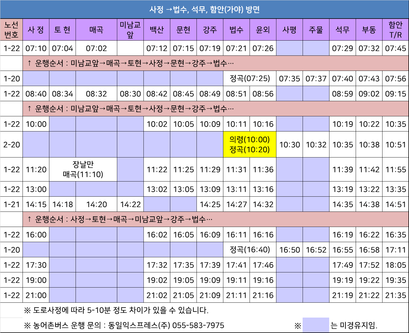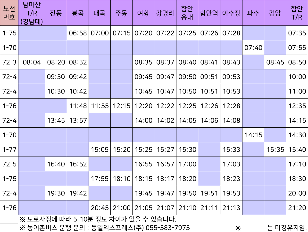 남마산T/R(경남대)→진동→봉곡→내곡→주동→여항→강명리→함안읍내→함안역→이수정→파수→검암→함안T/R
