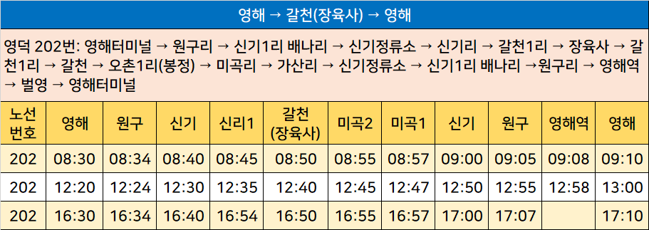 영해→갈천(장육사)→영해 노선정보: 영덕 202번