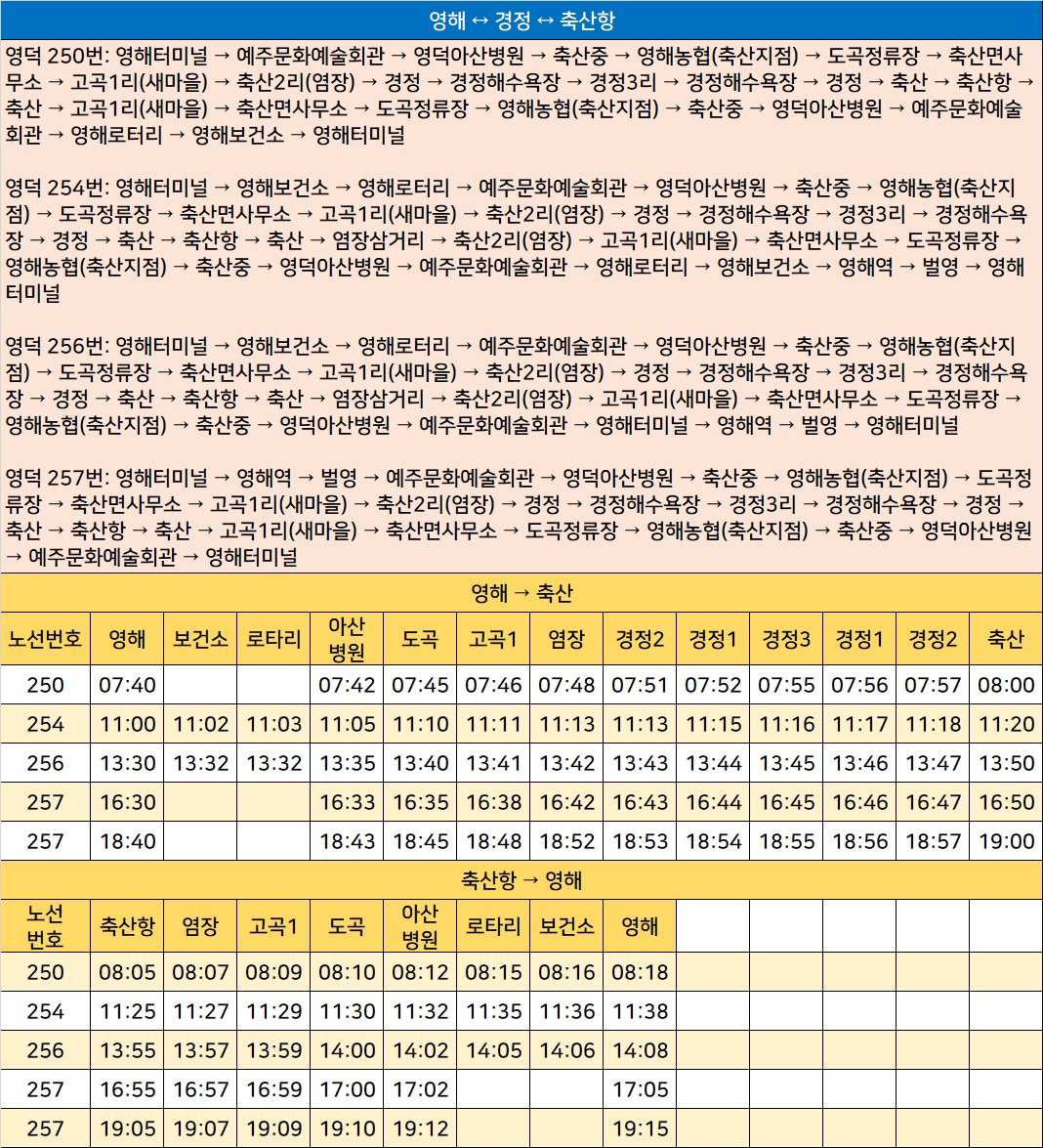 영해↔경정↔축산항 노선정보: 영덕 250번, 영덕 254번, 영덕 256번, 영덕 257번