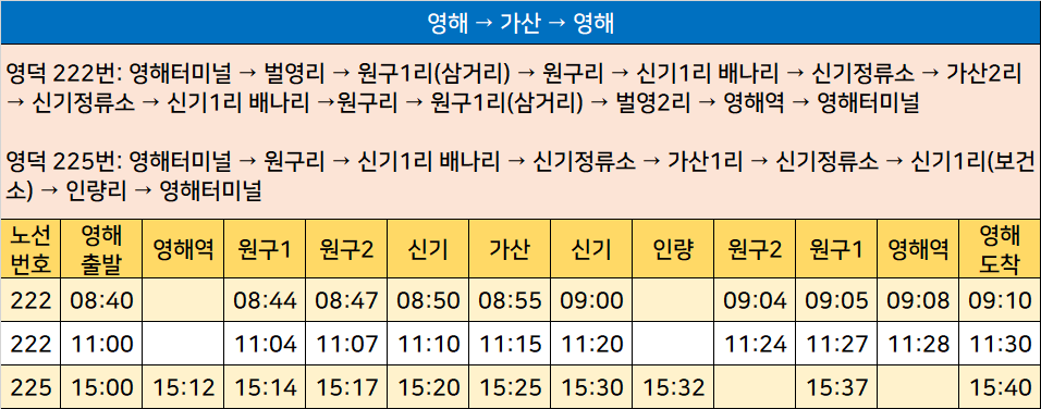 영해→가산→영해 노선정보: 영덕 222번, 영덕 225번