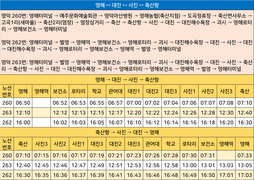 영해↔대진↔사진↔축산항 노선정보: 영덕 260번, 영덕262번, 영덕 263번