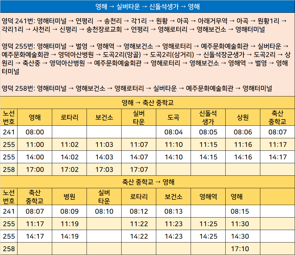 영덕 258번: 영해터미널 → 영해보건소 → 영해로터리 → 실버타운 → 예주문화예술회관 → 영해터미널