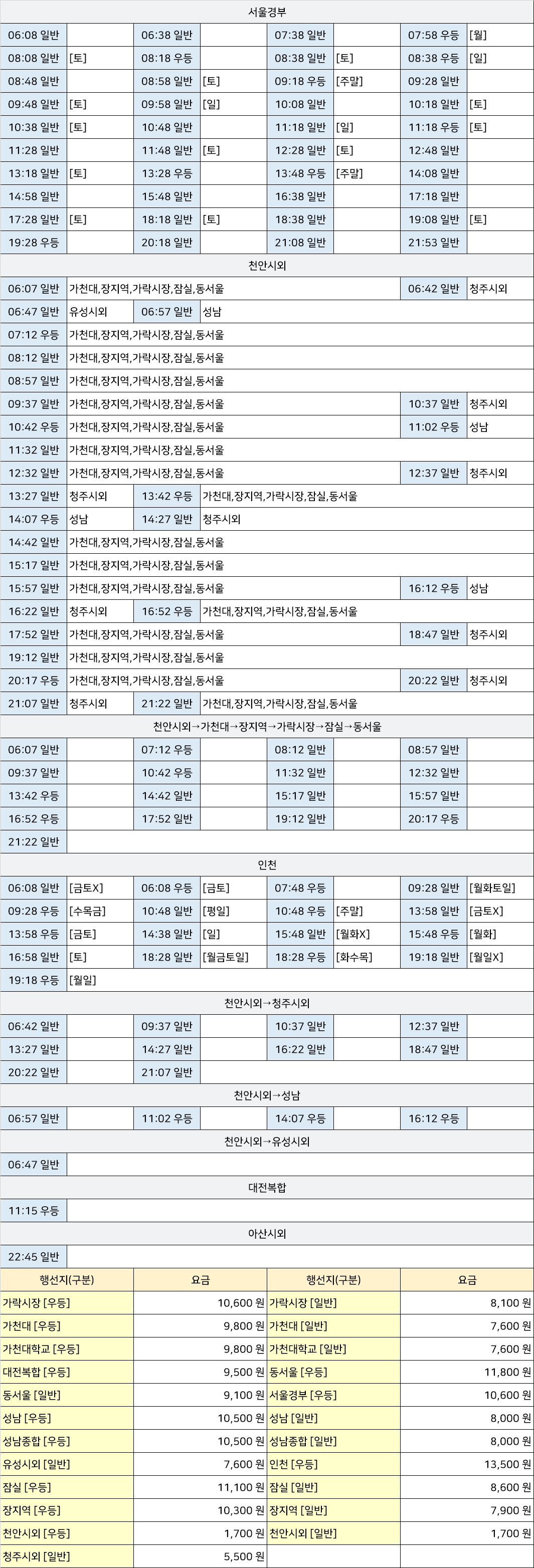 봉강교시외고속버스터미널 봉강교정류장 봉강교정류소 → "대전,서울경부,아산시외,인천,천안시외→가천대→장지역→가락시장→잠실→동서울,천안시외→성남,천안시외→유성시외,천안시외→청주시외".