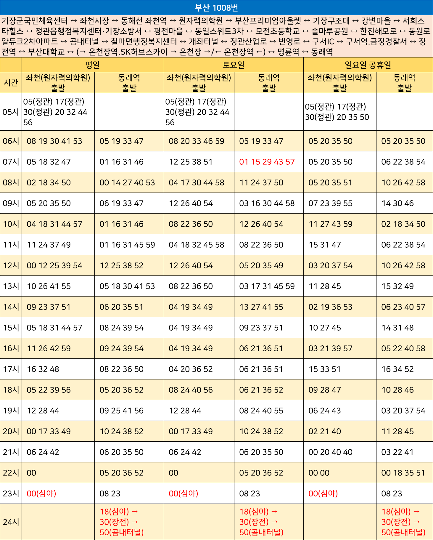부산 1008번: 기장군국민체육센터 ↔ 좌천시장 ↔ 동해선 좌천역 ↔ 원자력의학원 ↔ 부산프리미엄아울렛 ↔ 기장구조대 ↔ 강변마을 ↔ 서희스타힐스 ↔ 정관읍행정복지센터·기장소방서 ↔ 평전마을 ↔ 동일스위트3차 ↔ 모전초등학교 ↔ 솔마루공원 ↔ 한진해모로 ↔ 동원로얄듀크2차아파트 ↔ 곰내터널 ↔ 철마면행정복지센터 ↔ 개좌터널 ↔ 정관산업로 ↔ 번영로 ↔ 구서IC ↔ 구서역.금정경찰서 ↔ 장전역 ↔ 부산대학교 ↔ (→ 온천장역.SK허브스카이 → 온천장 →/← 온천장역 ←) ↔ 명륜역 ↔ 동래역