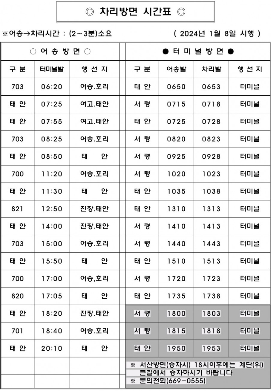- 태안: 07:30~22:00, 30~40분 간격 운행 (일반)