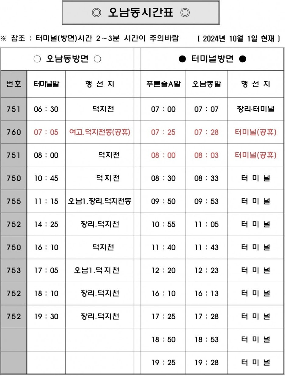 서산 755번: 서산터미널 ↔ 신주공아파트 ↔ 서산중 ↔ (→ 오남1통회관 → 장2통 → 장2통회관 →/← 오산초교 ←) ↔ 푸른솔아파트 ↔ 덕지천동