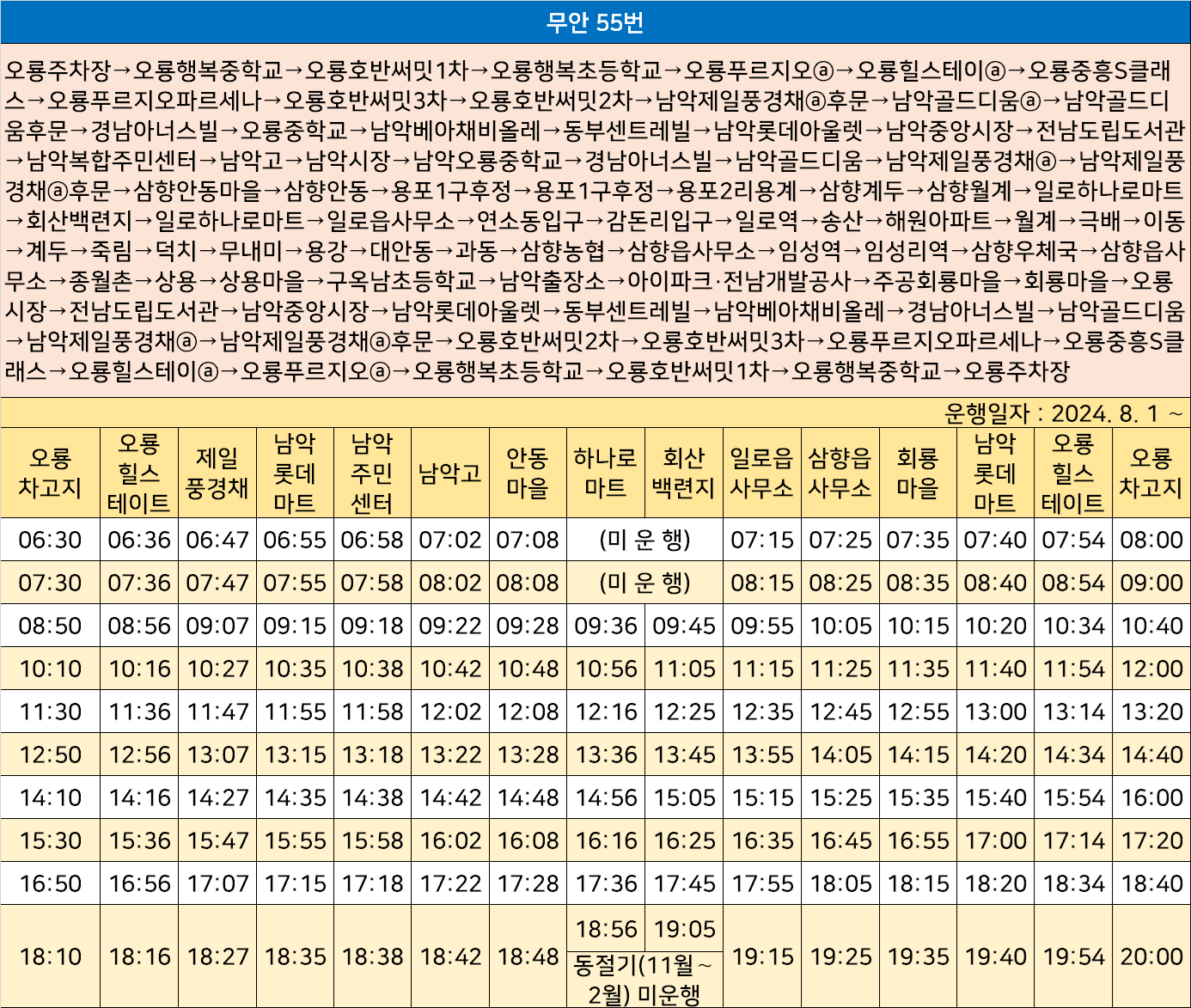 무안 55번: 오룡주차장→오룡행복중학교→오룡호반써밋1차→오룡행복초등학교→오룡푸르지오ⓐ→오룡힐스테이ⓐ→오룡중흥S클래스→오룡푸르지오파르세나→오룡호반써밋3차→오룡호반써밋2차→남악제일풍경채ⓐ후문→남악골드디움ⓐ→남악골드디움후문→경남아너스빌→오룡중학교→남악베아채비올레→동부센트레빌→남악롯데아울렛→남악중앙시장→전남도립도서관→남악복합주민센터→남악고→남악시장→남악오룡중학교→경남아너스빌→남악골드디움→남악제일풍경채ⓐ→남악제일풍경채ⓐ후문→삼향안동마을→삼향안동→용포1구후정→용포1구후정→용포2리용계→삼향계두→삼향월계→일로하나로마트→회산백련지→일로하나로마트→일로읍사무소→연소동입구→감돈리입구→일로역→송산→해원아파트→월계→극배→이동→계두→죽림→덕치→무내미→용강→대안동→과동→삼향농협→삼향읍사무소→임성역→임성리역→삼향우체국→삼향읍사무소→종월촌→상용→상용마을→구옥남초등학교→남악출장소→아이파크·전남개발공사→주공회룡마을→회룡마을→오룡시장→전남도립도서관→남악중앙시장→남악롯데아울렛→동부센트레빌→남악베아채비올레→경남아너스빌→남악골드디움→남악제일풍경채ⓐ→남악제일풍경채ⓐ후문→오룡호반써밋2차→오룡호반써밋3차→오룡푸르지오파르세나→오룡중흥S클래스→오룡힐스테이ⓐ→오룡푸르지오ⓐ→오룡행복초등학교→오룡호반써밋1차→오룡행복중학교→오룡주차장
