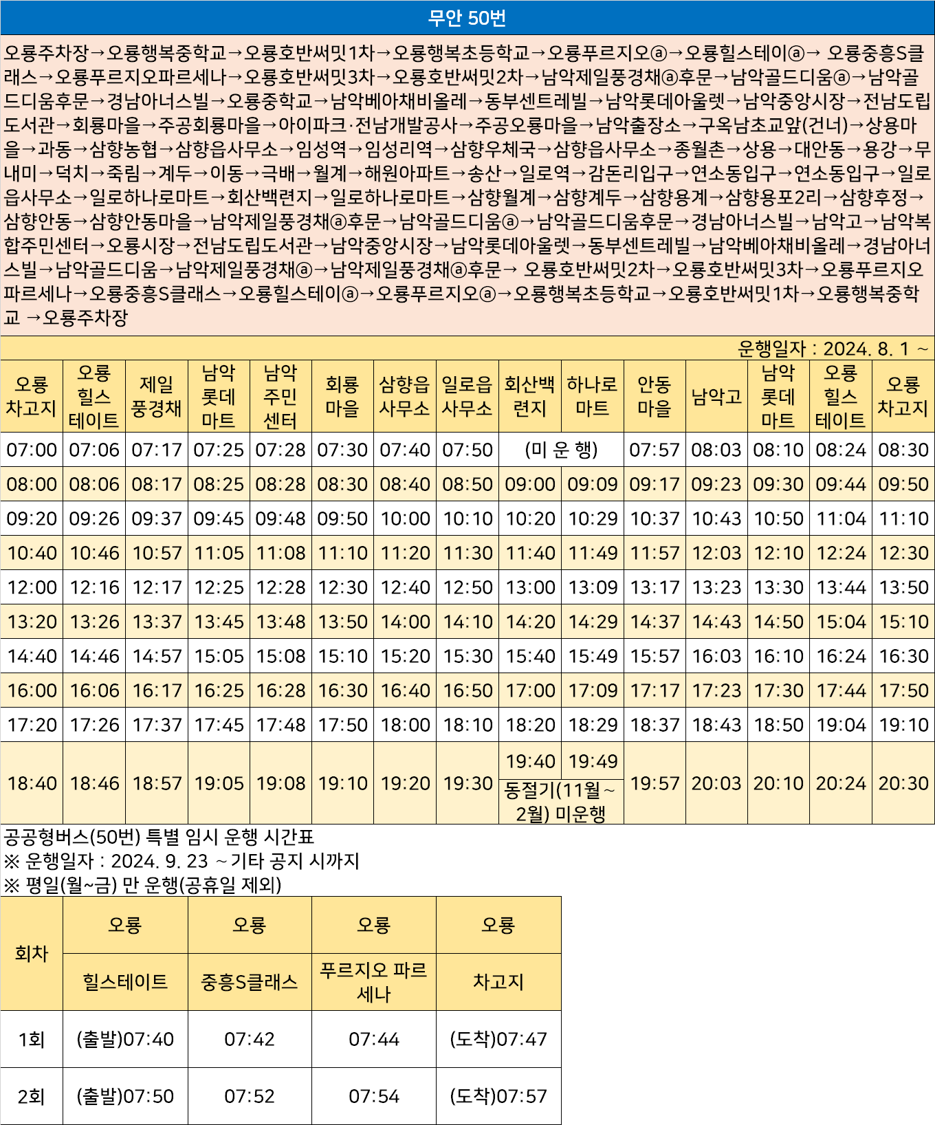 무안 50번: 오룡주차장→오룡행복중학교→오룡호반써밋1차→오룡행복초등학교→오룡푸르지오ⓐ→오룡힐스테이ⓐ→ 오룡중흥S클래스→오룡푸르지오파르세나→오룡호반써밋3차→오룡호반써밋2차→남악제일풍경채ⓐ후문→남악골드디움ⓐ→남악골드디움후문→경남아너스빌→오룡중학교→남악베아채비올레→동부센트레빌→남악롯데아울렛→남악중앙시장→전남도립도서관→회룡마을→주공회룡마을→아이파크·전남개발공사→주공오룡마을→남악출장소→구옥남초교앞(건너)→상용마을→과동→삼향농협→삼향읍사무소→임성역→임성리역→삼향우체국→삼향읍사무소→종월촌→상용→대안동→용강→무내미→덕치→죽림→계두→이동→극배→월계→해원아파트→송산→일로역→감돈리입구→연소동입구→연소동입구→일로읍사무소→일로하나로마트→회산백련지→일로하나로마트→삼향월계→삼향계두→삼향용계→삼향용포2리→삼향후정→삼향안동→삼향안동마을→남악제일풍경채ⓐ후문→남악골드디움ⓐ→남악골드디움후문→경남아너스빌→남악고→남악복합주민센터→오룡시장→전남도립도서관→남악중앙시장→남악롯데아울렛→동부센트레빌→남악베아채비올레→경남아너스빌→남악골드디움→남악제일풍경채ⓐ→남악제일풍경채ⓐ후문→ 오룡호반써밋2차→오룡호반써밋3차→오룡푸르지오파르세나→오룡중흥S클래스→오룡힐스테이ⓐ→오룡푸르지오ⓐ→오룡행복초등학교→오룡호반써밋1차→오룡행복중학교 →오룡주차장