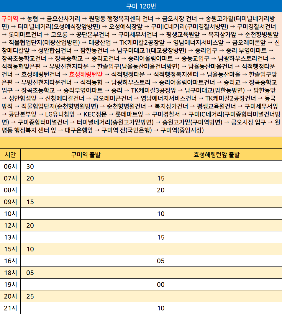 구미 120번: 구미역 → 농협 → 금오산사거리 → 원평동 행정복지센터 건너 → 금오시장 건너 → 송원고가밑 → 터미널네거리 → 오성예식장앞 → 구미IC네거리 → 구미경찰서건너 → 롯데마트건너 → 코오롱 → 공단본부건너 → 구미세무서건너 → 평생교육원앞 → 복지상가앞 → 순천향병원앞 → 직물협업단지 → 태광산업 → TK케미칼2공장앞 → 영남에너지서비스앞 → 금오레미콘앞 → 신창메디칼앞 → 성안합섬건너 → 팜한농건너 → 남구미대교1 → 중리입구 → 중리 부영아파트 → 장곡초등학교건너 → 장곡중학교 → 중리교건너 → 중리어울림아파트 → 중동교입구 → 남광하우스토리건너 → 석적농협맞은편 → 우방신천지타운 → 한솔입구 → 남율동산마을건너 → 석적행정타운건너 → 효성해링턴건너 → 효성해링턴앞 → 석적행정타운 → 석적행정복지센터 → 남율동산마을 → 한솔입구맞은편 → 우방신천지타운건너 → 석적농협 → 남광하우스토리 → 중리어울림아파트건너 → 중리교 → 장곡중학교입구 → 장곡초등학교 → 중리부영아파트 → 중리 → TK케미칼3공장앞 → 남구미대교 → 팜한농앞 → 성안합섬앞 → 신창메디칼건너 → 금오레미콘건너 → 영남에너지서비스건너 → TK케미칼2공장건너 → 동국방직 → 직물협업단지 → 순천향병원건너 → 복지상가건너 → 평생교육원건너 → 구미세무서앞 → 공단본부앞 → LG유니참앞 → KEC정문 → 롯데마트앞 → 구미경찰서 → 구미IC네거리 → 구미종합터미널건너 → 터미널네거리 → 송원고가밑 → 금오시장 입구 → 원평동 행정복지 센터 앞 → 대구은행앞 → 구미역 전 → 구미역