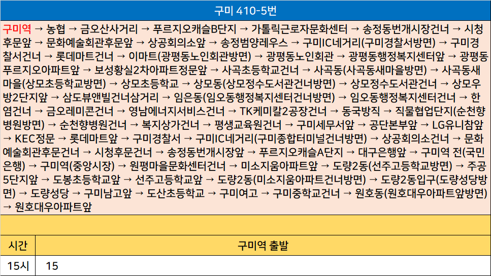 구미 410-5번: 구미역 → 농협 → 금오산사거리 → 푸르지오캐슬B단지 → 가톨릭근로자문화센터 → 송정동번개시장건너 → 시청후문앞 → 문화예술회관후문앞 → 상공회의소앞 → 송정범양레우스 → 구미IC네거리 → 구미경찰서건너 → 롯데마트건너 → 이마트 → 광평동노인회관 → 광평동행정복지센터앞 → 광평동푸르지오아파트앞 → 보성황실2차아파트정문앞 → 사곡초등학교건너 → 사곡동 → 사곡동새마을 → 상모초등학교 → 상모동 → 상모정수도서관건너 → 상모우방2단지앞 → 삼도뷰앤빌건너삼거리 → 임은동 → 임오동행정복지센터건너 → 한염건너 → 금오레미콘건너 → 영남에너지서비스건너 → TK케미칼2공장건너 → 동국방직 → 직물협업단지 → 순천향병원건너 → 복지상가건너 → 평생교육원건너 → 구미세무서앞 → 공단본부앞 → LG유니참앞 → KEC정문 → 롯데마트앞 → 구미경찰서 → 구미IC네거리 → 상공회의소건너 → 문화예술회관후문건너 → 시청후문건너 → 송정동번개시장앞 → 푸르지오캐슬A단지 → 대구은행앞 → 구미역 전 → 구미역 → 원평마을문화센터건너 → 미소지움아파트앞 → 도량2동 → 주공5단지앞 → 도봉초등학교앞 → 선주고등학교앞 → 도량2동 → 도량2동입구 → 도량성당 → 구미남고앞 → 도산초등학교 → 구미여고 → 구미중학교건너 → 원호동 → 원호대우아파트앞