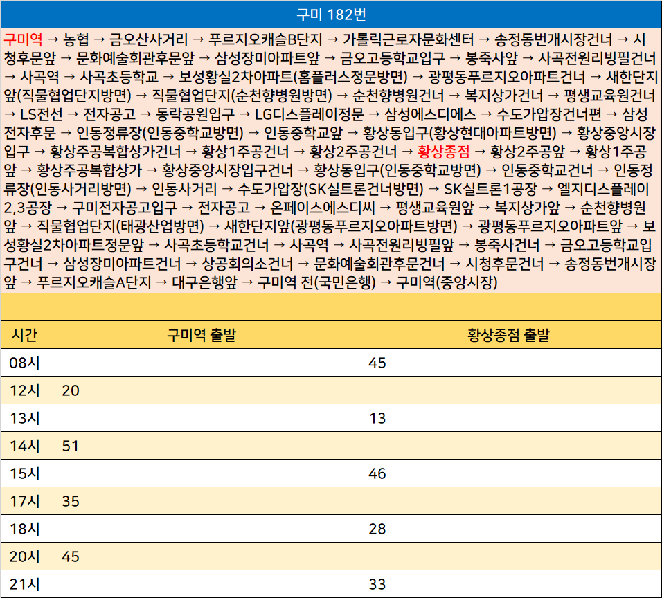 구미 182번: 구미역 → 농협 → 금오산사거리 → 푸르지오캐슬B단지 → 가톨릭근로자문화센터 → 송정동번개시장건너 → 시청후문앞 → 문화예술회관후문앞 → 삼성장미아파트앞 → 금오고등학교입구 → 봉죽사앞 → 사곡전원리빙필건너 → 사곡역 → 사곡초등학교 → 보성황실2차아파트 → 광평동푸르지오아파트건너 → 새한단지앞 → 직물협업단지 → 순천향병원건너 → 복지상가건너 → 평생교육원건너 → LS전선 → 전자공고 → 동락공원입구 → LG디스플레이정문 → 삼성에스디에스 → 수도가압장건너편 → 삼성전자후문 → 인동정류장 → 인동중학교앞 → 황상동입구 → 황상중앙시장입구 → 황상주공복합상가건너 → 황상1주공건너 → 황상2주공건너 → 황상종점 → 황상2주공앞 → 황상1주공앞 → 황상주공복합상가 → 황상중앙시장입구건너 → 황상동입구 → 인동중학교건너 → 인동정류장 → 인동사거리 → 수도가압장 → SK실트론1공장 → 엘지디스플레이2,3공장 → 구미전자공고입구 → 전자공고 → 온페이스에스디씨 → 평생교육원앞 → 복지상가앞 → 순천향병원앞 → 직물협업단지 → 새한단지앞 → 광평동푸르지오아파트앞 → 보성황실2차아파트정문앞 → 사곡초등학교건너 → 사곡역 → 사곡전원리빙필앞 → 봉죽사건너 → 금오고등학교입구건너 → 삼성장미아파트건너 → 상공회의소건너 → 문화예술회관후문건너 → 시청후문건너 → 송정동번개시장앞 → 푸르지오캐슬A단지 → 대구은행앞 → 구미역 전 → 구미역