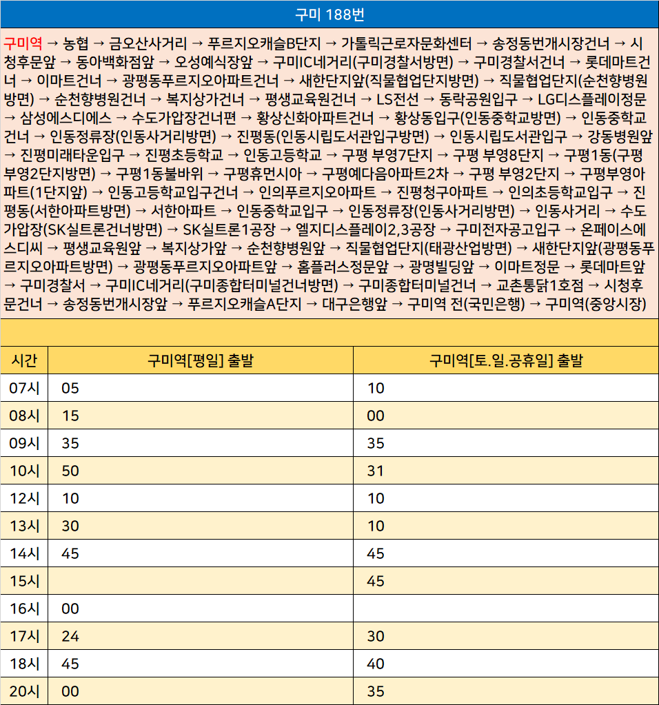 구미 188번: 구미역 → 농협 → 금오산사거리 → 푸르지오캐슬B단지 → 가톨릭근로자문화센터 → 송정동번개시장건너 → 시청후문앞 → 동아백화점앞 → 오성예식장앞 → 구미IC네거리 → 구미경찰서건너 → 롯데마트건너 → 이마트건너 → 광평동푸르지오아파트건너 → 새한단지앞 → 직물협업단지 → 순천향병원건너 → 복지상가건너 → 평생교육원건너 → LS전선 → 동락공원입구 → LG디스플레이정문 → 삼성에스디에스 → 수도가압장건너편 → 황상신화아파트건너 → 황상동입구 → 인동중학교건너 → 인동정류장 → 진평동 → 인동시립도서관입구 → 강동병원앞 → 진평미래타운입구 → 진평초등학교 → 인동고등학교 → 구평 부영7단지 → 구평 부영8단지 → 구평1동 → 구평1동불바위 → 구평휴먼시아 → 구평예다음아파트2차 → 구평 부영2단지 → 구평부영아파트 → 인동고등학교입구건너 → 인의푸르지오아파트 → 진평청구아파트 → 인의초등학교입구 → 진평동 → 서한아파트 → 인동중학교입구 → 인동정류장 → 인동사거리 → 수도가압장 → SK실트론1공장 → 엘지디스플레이2,3공장 → 구미전자공고입구 → 온페이스에스디씨 → 평생교육원앞 → 복지상가앞 → 순천향병원앞 → 직물협업단지 → 새한단지앞 → 광평동푸르지오아파트앞 → 홈플러스정문앞 → 광명빌딩앞 → 이마트정문 → 롯데마트앞 → 구미경찰서 → 구미IC네거리 → 구미종합터미널건너 → 교촌통닭1호점 → 시청후문건너 → 송정동번개시장앞 → 푸르지오캐슬A단지 → 대구은행앞 → 구미역 전 → 구미역