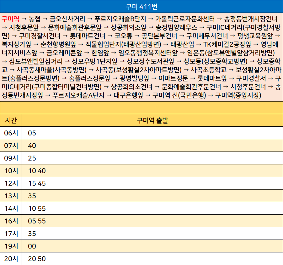 구미 411번: 구미역 → 농협 → 금오산사거리 → 푸르지오캐슬B단지 → 가톨릭근로자문화센터 → 송정동번개시장건너 → 시청후문앞 → 문화예술회관후문앞 → 상공회의소앞 → 송정범양레우스 → 구미IC네거리 → 구미경찰서건너 → 롯데마트건너 → 코오롱 → 공단본부건너 → 구미세무서건너 → 평생교육원앞 → 복지상가앞 → 순천향병원앞 → 직물협업단지 → 태광산업 → TK케미칼2공장앞 → 영남에너지서비스앞 → 금오레미콘앞 → 한염앞 → 임오동행정복지센터앞 → 임은동 → 삼도뷰앤빌앞삼거리 → 상모우방1단지앞 → 상모정수도서관앞 → 상모동 → 상모중학교 → 사곡동새마을 → 사곡동 → 사곡초등학교 → 보성황실2차아파트 → 홈플러스정문앞 → 광명빌딩앞 → 이마트정문 → 롯데마트앞 → 구미경찰서 → 구미IC네거리 → 상공회의소건너 → 문화예술회관후문건너 → 시청후문건너 → 송정동번개시장앞 → 푸르지오캐슬A단지 → 대구은행앞 → 구미역 전 → 구미역