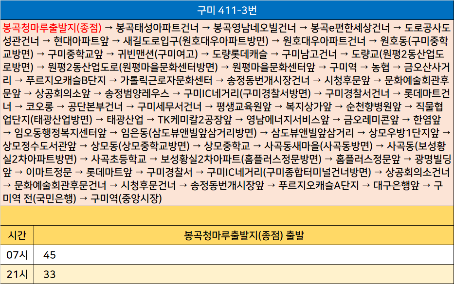 구미 411-3번: 봉곡청마루출발지 → 봉곡태성아파트건너 → 봉곡영남네오빌건너 → 봉곡e편한세상건너 → 도로공사도성관건너 → 현대아파트앞 → 새길도로입구 → 원호대우아파트건너 → 원호동 → 구미중학교앞 → 귀빈맨션 → 도량롯데캐슬 → 구미남고건너 → 도량교 → 원평2동산업도로 → 원평마을문화센터앞 → 구미역 → 농협 → 금오산사거리 → 푸르지오캐슬B단지 → 가톨릭근로자문화센터 → 송정동번개시장건너 → 시청후문앞 → 문화예술회관후문앞 → 상공회의소앞 → 송정범양레우스 → 구미IC네거리 → 구미경찰서건너 → 롯데마트건너 → 코오롱 → 공단본부건너 → 구미세무서건너 → 평생교육원앞 → 복지상가앞 → 순천향병원앞 → 직물협업단지 → 태광산업 → TK케미칼2공장앞 → 영남에너지서비스앞 → 금오레미콘앞 → 한염앞 → 임오동행정복지센터앞 → 임은동 → 삼도뷰앤빌앞삼거리 → 상모우방1단지앞 → 상모정수도서관앞 → 상모동 → 상모중학교 → 사곡동새마을 → 사곡동 → 사곡초등학교 → 보성황실2차아파트 → 홈플러스정문앞 → 광명빌딩앞 → 이마트정문 → 롯데마트앞 → 구미경찰서 → 구미IC네거리 → 상공회의소건너 → 문화예술회관후문건너 → 시청후문건너 → 송정동번개시장앞 → 푸르지오캐슬A단지 → 대구은행앞 → 구미역 전 → 구미역
