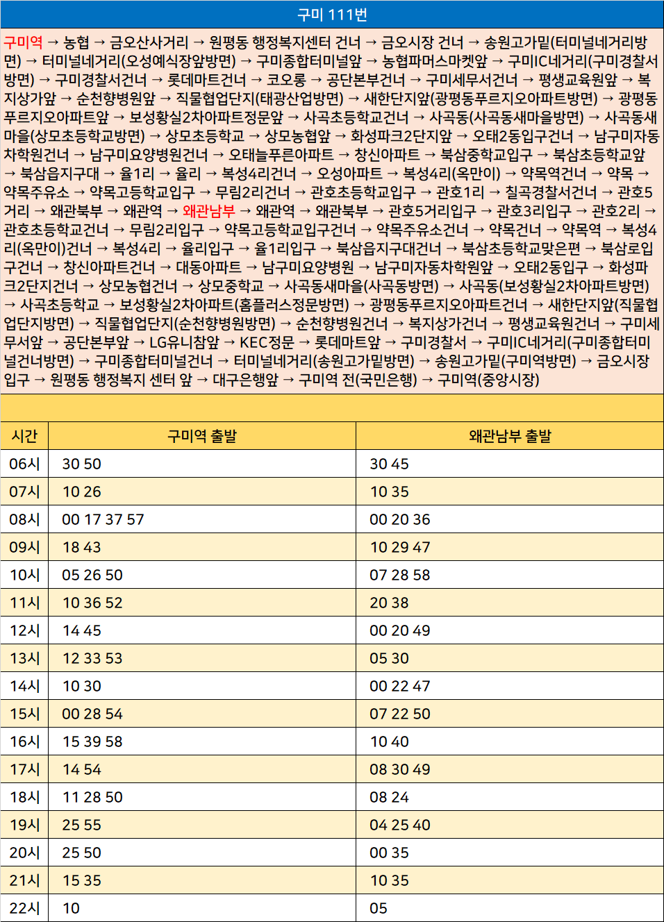 구미 111번: 구미역 → 농협 → 금오산사거리 → 원평동 행정복지센터 건너 → 금오시장 건너 → 송원고가밑 → 터미널네거리 → 구미종합터미널앞 → 농협파머스마켓앞 → 구미IC네거리 → 구미경찰서건너 → 롯데마트건너 → 코오롱 → 공단본부건너 → 구미세무서건너 → 평생교육원앞 → 복지상가앞 → 순천향병원앞 → 직물협업단지 → 새한단지앞 → 광평동푸르지오아파트앞 → 보성황실2차아파트정문앞 → 사곡초등학교건너 → 사곡동 → 사곡동새마을 → 상모초등학교 → 상모농협앞 → 화성파크2단지앞 → 오태2동입구건너 → 남구미자동차학원건너 → 남구미요양병원건너 → 오태늘푸른아파트 → 창신아파트 → 북삼중학교입구 → 북삼초등학교앞 → 북삼읍지구대 → 율1리 → 율리 → 복성4리건너 → 오성아파트 → 복성4리 → 약목역건너 → 약목 → 약목주유소 → 약목고등학교입구 → 무림2리건너 → 관호초등학교입구 → 관호1리 → 칠곡경찰서건너 → 관호5거리 → 왜관북부 → 왜관역 → 왜관남부 → 왜관역 → 왜관북부 → 관호5거리입구 → 관호3리입구 → 관호2리 → 관호초등학교건너 → 무림2리입구 → 약목고등학교입구건너 → 약목주유소건너 → 약목건너 → 약목역 → 복성4리건너 → 복성4리 → 율리입구 → 율1리입구 → 북삼읍지구대건너 → 북삼초등학교맞은편 → 북삼로입구건너 → 창신아파트건너 → 대동아파트 → 남구미요양병원 → 남구미자동차학원앞 → 오태2동입구 → 화성파크2단지건너 → 상모농협건너 → 상모중학교 → 사곡동새마을 → 사곡동 → 사곡초등학교 → 보성황실2차아파트 → 광평동푸르지오아파트건너 → 새한단지앞 → 직물협업단지 → 순천향병원건너 → 복지상가건너 → 평생교육원건너 → 구미세무서앞 → 공단본부앞 → LG유니참앞 → KEC정문 → 롯데마트앞 → 구미경찰서 → 구미IC네거리 → 구미종합터미널건너 → 터미널네거리 → 송원고가밑 → 금오시장 입구 → 원평동 행정복지 센터 앞 → 대구은행앞 → 구미역 전 → 구미역