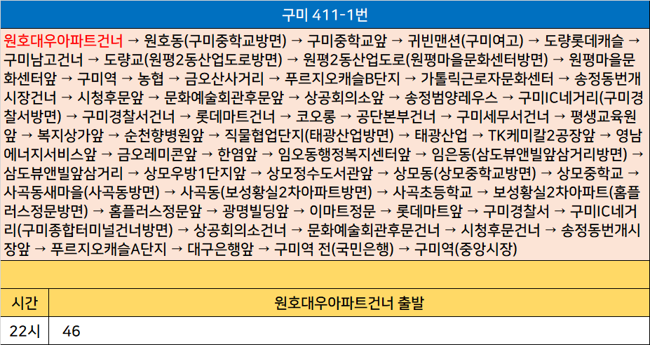구미 411-1번: 원호대우아파트건너 → 원호동 → 구미중학교앞 → 귀빈맨션 → 도량롯데캐슬 → 구미남고건너 → 도량교 → 원평2동산업도로 → 원평마을문화센터앞 → 구미역 → 농협 → 금오산사거리 → 푸르지오캐슬B단지 → 가톨릭근로자문화센터 → 송정동번개시장건너 → 시청후문앞 → 문화예술회관후문앞 → 상공회의소앞 → 송정범양레우스 → 구미IC네거리 → 구미경찰서건너 → 롯데마트건너 → 코오롱 → 공단본부건너 → 구미세무서건너 → 평생교육원앞 → 복지상가앞 → 순천향병원앞 → 직물협업단지 → 태광산업 → TK케미칼2공장앞 → 영남에너지서비스앞 → 금오레미콘앞 → 한염앞 → 임오동행정복지센터앞 → 임은동 → 삼도뷰앤빌앞삼거리 → 상모우방1단지앞 → 상모정수도서관앞 → 상모동 → 상모중학교 → 사곡동새마을 → 사곡동 → 사곡초등학교 → 보성황실2차아파트 → 홈플러스정문앞 → 광명빌딩앞 → 이마트정문 → 롯데마트앞 → 구미경찰서 → 구미IC네거리 → 상공회의소건너 → 문화예술회관후문건너 → 시청후문건너 → 송정동번개시장앞 → 푸르지오캐슬A단지 → 대구은행앞 → 구미역 전 → 구미역