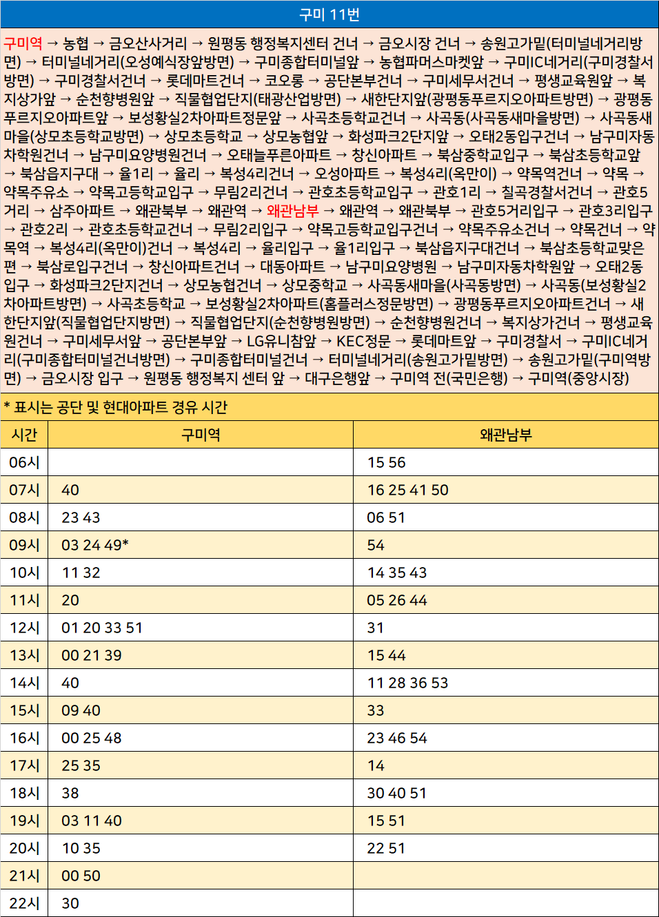 구미 11번: 구미역 → 농협 → 금오산사거리 → 원평동 행정복지센터 건너 → 금오시장 건너 → 송원고가밑 → 터미널네거리 → 구미종합터미널앞 → 농협파머스마켓앞 → 구미IC네거리 → 구미경찰서건너 → 롯데마트건너 → 코오롱 → 공단본부건너 → 구미세무서건너 → 평생교육원앞 → 복지상가앞 → 순천향병원앞 → 직물협업단지 → 새한단지앞 → 광평동푸르지오아파트앞 → 보성황실2차아파트정문앞 → 사곡초등학교건너 → 사곡동 → 사곡동새마을 → 상모초등학교 → 상모농협앞 → 화성파크2단지앞 → 오태2동입구건너 → 남구미자동차학원건너 → 남구미요양병원건너 → 오태늘푸른아파트 → 창신아파트 → 북삼중학교입구 → 북삼초등학교앞 → 북삼읍지구대 → 율1리 → 율리 → 복성4리건너 → 오성아파트 → 복성4리 → 약목역건너 → 약목 → 약목주유소 → 약목고등학교입구 → 무림2리건너 → 관호초등학교입구 → 관호1리 → 칠곡경찰서건너 → 관호5거리 → 삼주아파트 → 왜관북부 → 왜관역 → 왜관남부 → 왜관역 → 왜관북부 → 관호5거리입구 → 관호3리입구 → 관호2리 → 관호초등학교건너 → 무림2리입구 → 약목고등학교입구건너 → 약목주유소건너 → 약목건너 → 약목역 → 복성4리건너 → 복성4리 → 율리입구 → 율1리입구 → 북삼읍지구대건너 → 북삼초등학교맞은편 → 북삼로입구건너 → 창신아파트건너 → 대동아파트 → 남구미요양병원 → 남구미자동차학원앞 → 오태2동입구 → 화성파크2단지건너 → 상모농협건너 → 상모중학교 → 사곡동새마을 → 사곡동 → 사곡초등학교 → 보성황실2차아파트 → 광평동푸르지오아파트건너 → 새한단지앞 → 직물협업단지 → 순천향병원건너 → 복지상가건너 → 평생교육원건너 → 구미세무서앞 → 공단본부앞 → LG유니참앞 → KEC정문 → 롯데마트앞 → 구미경찰서 → 구미IC네거리 → 구미종합터미널건너 → 터미널네거리 → 송원고가밑 → 금오시장 입구 → 원평동 행정복지 센터 앞 → 대구은행앞 → 구미역 전 → 구미역