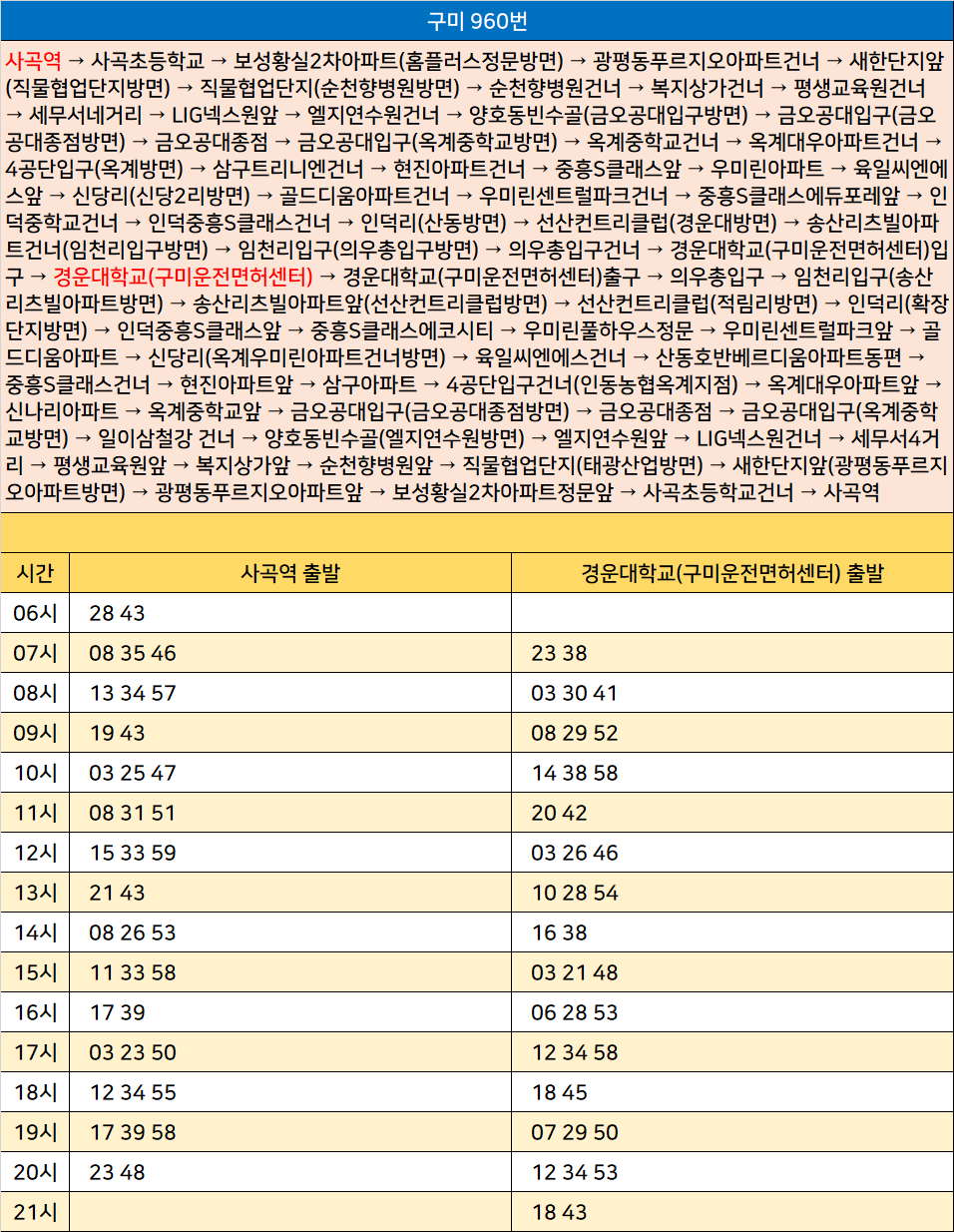 구미 960번: 사곡역 → 사곡초등학교 → 보성황실2차아파트 → 광평동푸르지오아파트건너 → 새한단지앞 → 직물협업단지 → 순천향병원건너 → 복지상가건너 → 평생교육원건너 → 세무서네거리 → LIG넥스원앞 → 엘지연수원건너 → 양호동빈수골 → 금오공대입구 → 금오공대종점 → 금오공대입구 → 옥계중학교건너 → 옥계대우아파트건너 → 4공단입구 → 삼구트리니엔건너 → 현진아파트건너 → 중흥S클래스앞 → 우미린아파트 → 육일씨엔에스앞 → 신당리 → 골드디움아파트건너 → 우미린센트럴파크건너 → 중흥S클래스에듀포레앞 → 인덕중학교건너 → 인덕중흥S클래스건너 → 인덕리 → 선산컨트리클럽 → 송산리츠빌아파트건너 → 임천리입구 → 의우총입구건너 → 경운대학교입구 → 경운대학교 → 경운대학교출구 → 의우총입구 → 임천리입구 → 송산리츠빌아파트앞 → 선산컨트리클럽 → 인덕리 → 인덕중흥S클래스앞 → 중흥S클래스에코시티 → 우미린풀하우스정문 → 우미린센트럴파크앞 → 골드디움아파트 → 신당리 → 육일씨엔에스건너 → 산동호반베르디움아파트동편 → 중흥S클래스건너 → 현진아파트앞 → 삼구아파트 → 4공단입구건너 → 옥계대우아파트앞 → 신나리아파트 → 옥계중학교앞 → 금오공대입구 → 금오공대종점 → 금오공대입구 → 일이삼철강 건너 → 양호동빈수골 → 엘지연수원앞 → LIG넥스원건너 → 세무서4거리 → 평생교육원앞 → 복지상가앞 → 순천향병원앞 → 직물협업단지 → 새한단지앞 → 광평동푸르지오아파트앞 → 보성황실2차아파트정문앞 → 사곡초등학교건너 → 사곡역