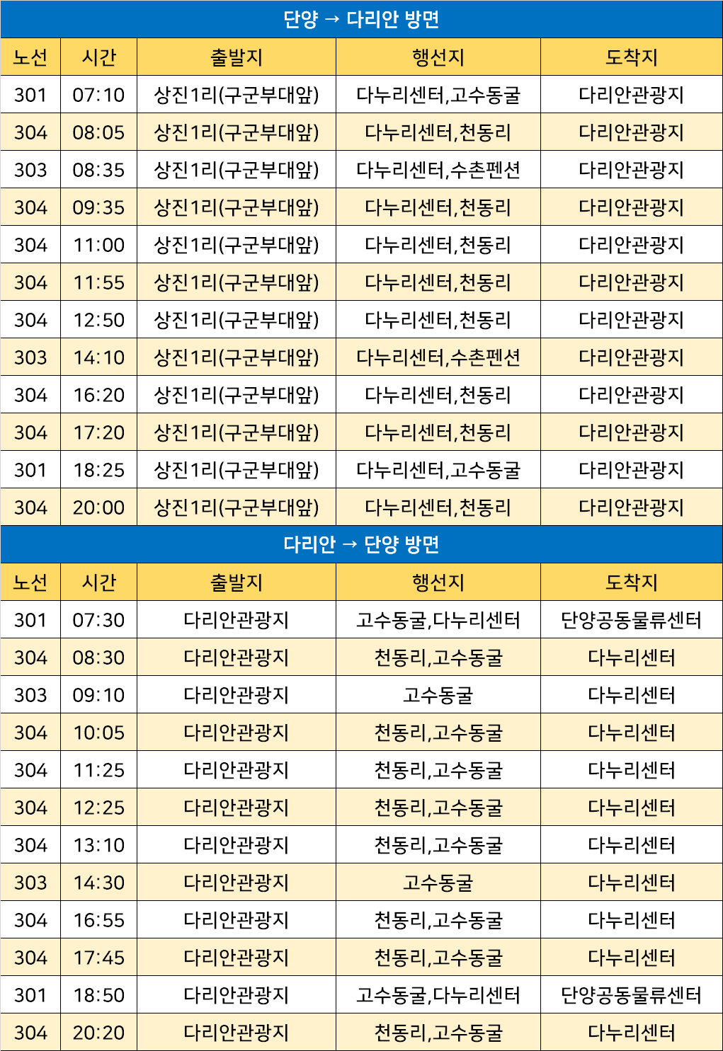 단양 300번대 노선: 단양 ↔ 다리안, 고수동굴, 다누리센터, 다리안관광지, 단양공동물류센터, 상진1리(구군부대앞), 수촌펜션, 천동리